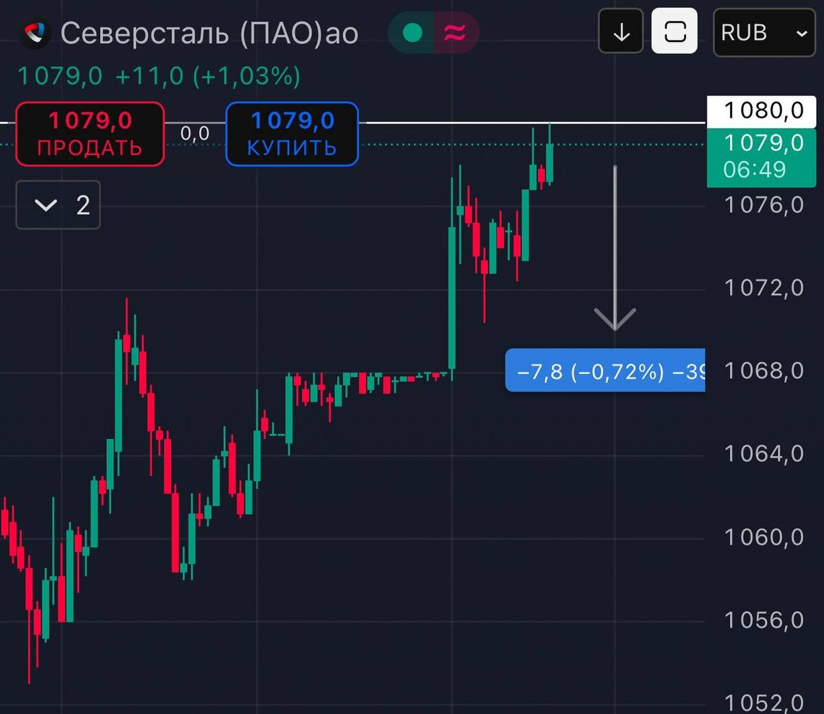 В ответ на пост 👉 На сегодня смотрел шорты на два плана. Первый план поближе к цене закрытия вчерашнего дня. Это была Северсталь. Она, после того, как дала вход, поехала вниз на 0,65%, а согласно стратегии в данном случае нужно двигать стоп в без убыток. Я закрыл северсталь в без убыток, с учетом комиссии. ✅ Сейчас же, индекс открыл основную торговую сессию с гэпом вверх, подрастая на утренней сессии, о чем кстати и писал вчера. Цели по локальному росту, как по мне подходят к концу, а значит сейчас начинаю посматривать в сторону шортов.
