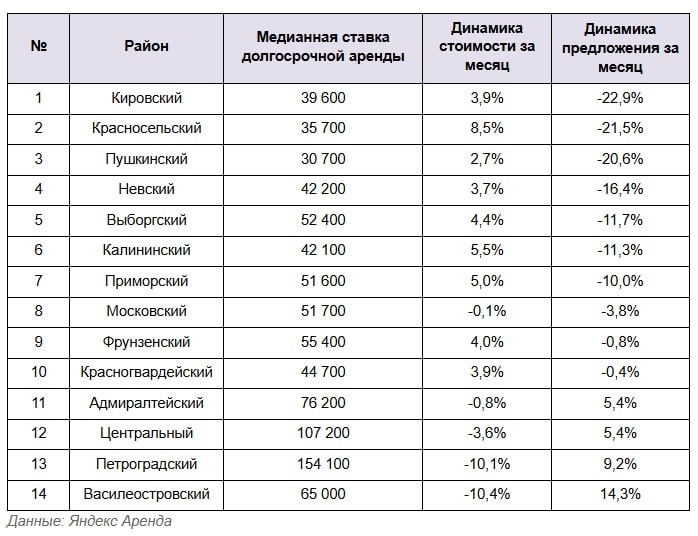 Это привело к увеличению медианной ставки в городе и в отдельных районах. В целом предложение сдаваемых квартир в июле сократилась в 10 районах Петербурга".