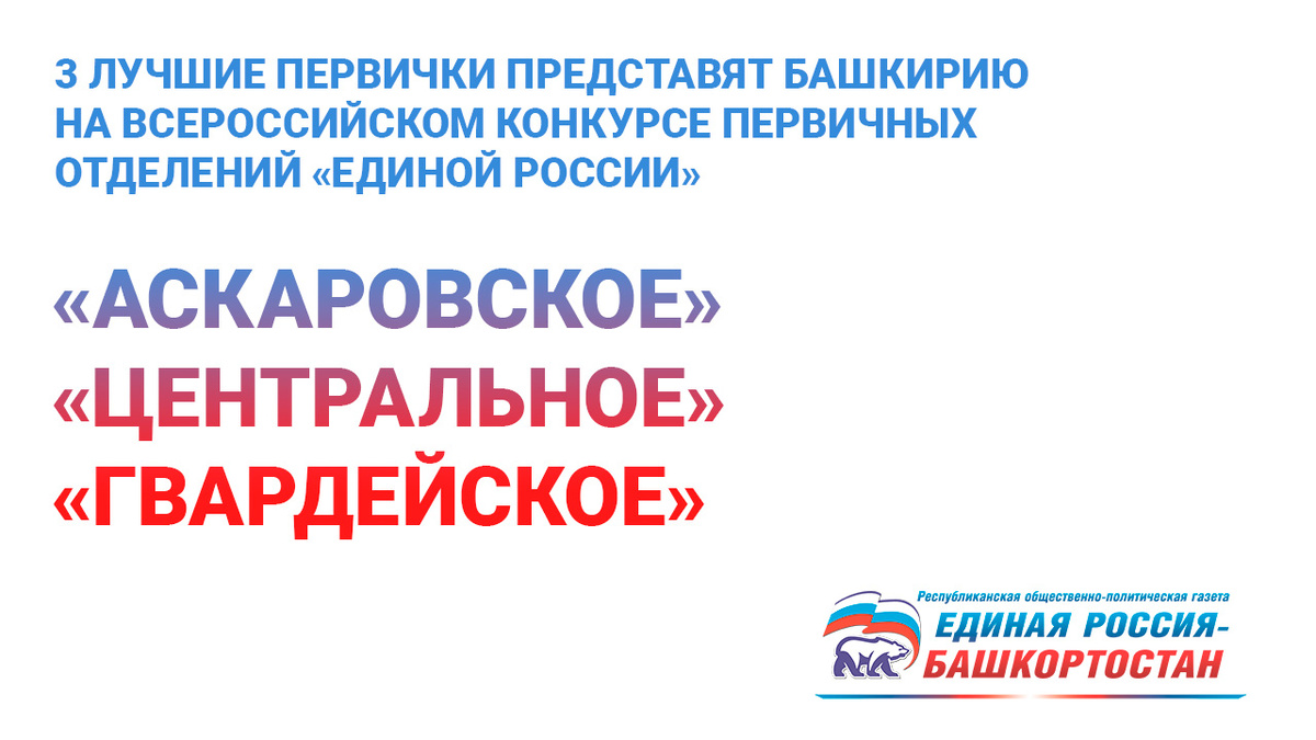 На региональный этап Всероссийского конкурса первичек в этом году было заявлено 345 проектов от 63 местных отделений партии. Девять из них отметило жюри, а лучшими признали «Аскаровское», «Центральное» и «Гвардейское». Именно они будут представлять республику на федеральном уровне. Первичные организации озвучили свои идеи в номинации «Лучшая практика реализации Народной программы партии». Комиссия оценивала работы по следующим критериям: непосредственное воздействие на качество воплощения в жизнь положений Народной программы, масштабность проекта, его эффективность, инновационность, уровень вовлеченности граждан, информирование о практике. После подведения итогов победителем среди сельских населенных пунктов признана первичка «Аскаровское» из Абзелиловского района. Второе и третье места заняли, соответственно, «Культурное» (с. Стерлибашево Стерлибашевского района) и «Батыровское» (с. Батырово Федоровского района). Первичное отделение «Центральное» Ленинского района г. Уфы победило в ка
