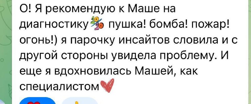 Это отзывы с сессий, которые были по 20-40 минут. Прикиньте, что МЫ С ВАМИ СДЕЛАЕМ за 1,5ч 🔥 К концу стратегической сессии Вы: •увидите картину своей жизни целиком (почему Вы там, где есть и как «оказаться» там, где Вам хочется) •получите план ваших конкретных действий (с ним хоть к психологу вашему, хоть самому заниматься; главное - следовать плану) •сократите годы жизни, потраченные на неправильные действия •из «у меня ничего не выйдет» уйдете с «теперь я знаю, что делать» Для тех, кто пропустил - все здесь. Успей записаться. Предложение до сентября (спойлер: потом цена будет выше).