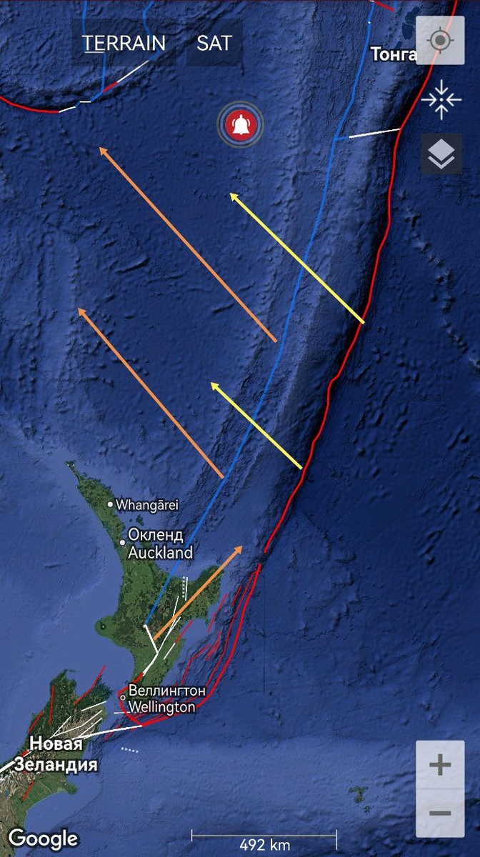 Относительно ОСТИ по границам плиты Кермадек полностью не уверен. На закате в облачном массиве наблюдались провалы, напоминающие границы плиты (с поворотом всей конструкции против часовой стрелки). Если это всё же ОСТИ, то картина тянет на М7+. ==== I am not completely sure about the CSTI along the boundaries of the Kermadec plate. At sunset, dips resembling plate boundaries were observed in the cloud array (with the entire structure turning counterclockwise). If this is a CSTI, then the picture pulls on the M7+.