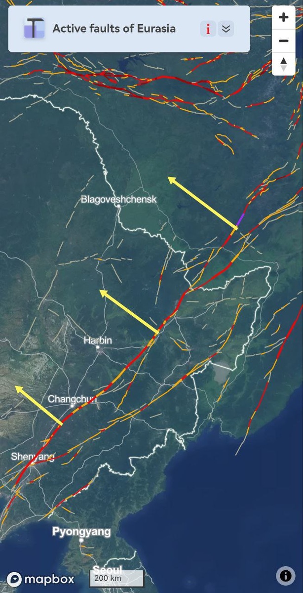Ночью в Китае на границе с Дальним Востоком РФ трассировался один из разломов на уровне М6 (может быть связано с японскими напрягами, поэтому соседние разломы трещат)