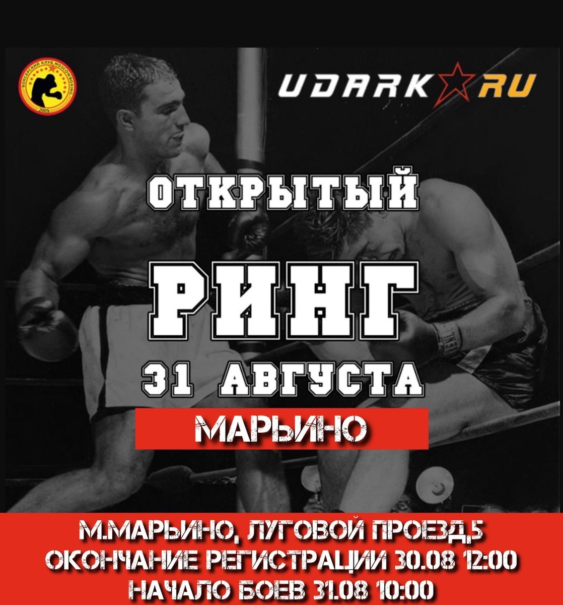 ‼ПРОВЕРЬ СЕБЯ ПОСЛЕ ЛЕТА И СБОРОВ‼ 👊БОКСИРУЙ НА ОТКРЫТОМ РИНГЕ👊 🏆 https://udarka.ru/event/199/otkrytyy-ring-31-avgusta-marino 🏆 ОТКРЫТЫЙ РИНГ 31 АВГУСТА 31 АВГУСТА 2025 года проводится открытый ринг по боксу г. Москва, метро “МАРЬИНО", Луговой проезд,5, эт.4, клуб МОСБОКС Начало боев в 10:00 Начало взвешивания в 9:00 окончание регистрации на турнир и приема вступительных взносов - 30.08.2025 , 12:00