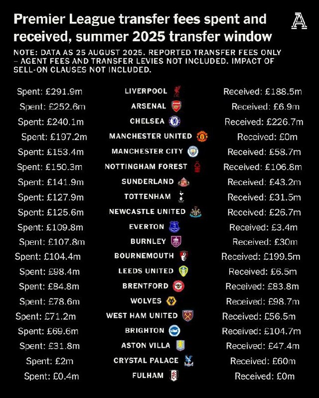 Обновленная табличка, сколько клубы Премьер-Лиги потратили и заработали на трансферном рынке этим летом 💰
