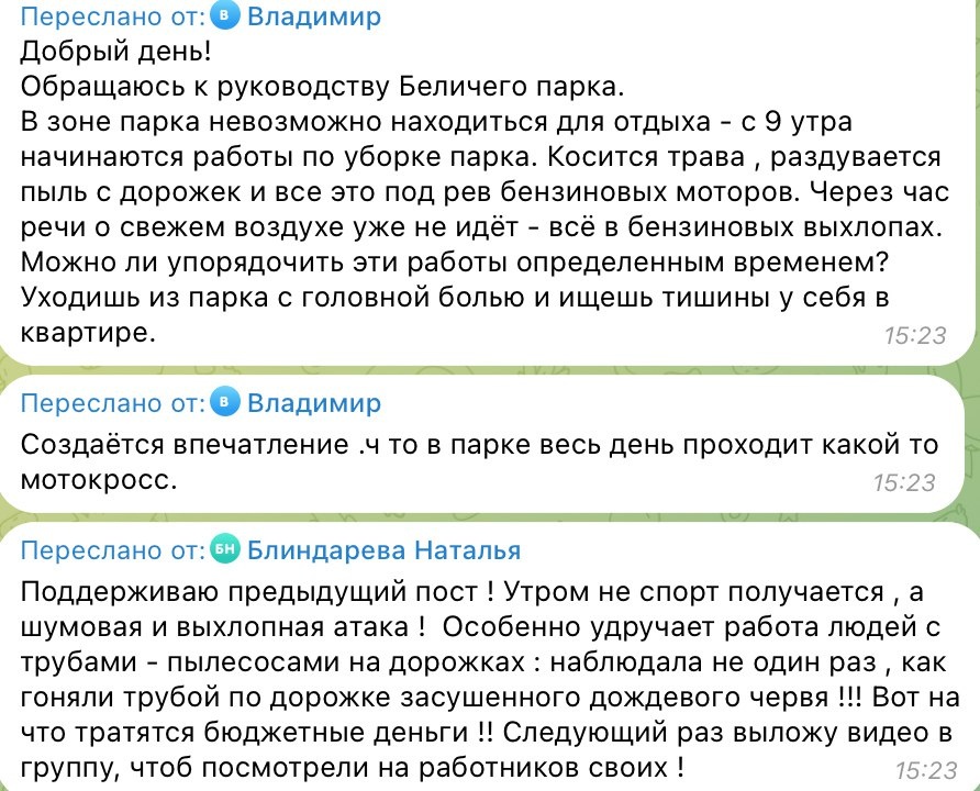 Тишина и свежий воздух в парке? К сожалению, нет. В Беличьем парке невозможно отдохнуть — с утра его заполняют рёв моторов и запах бензина от воздуходувок. Из-за нескольких опавших листков убивают всю атмосферу. Руководству парка, можно ли ограничить шумную уборку определёнными часами? Хочется дышать свежим воздухом, а не выхлопами.