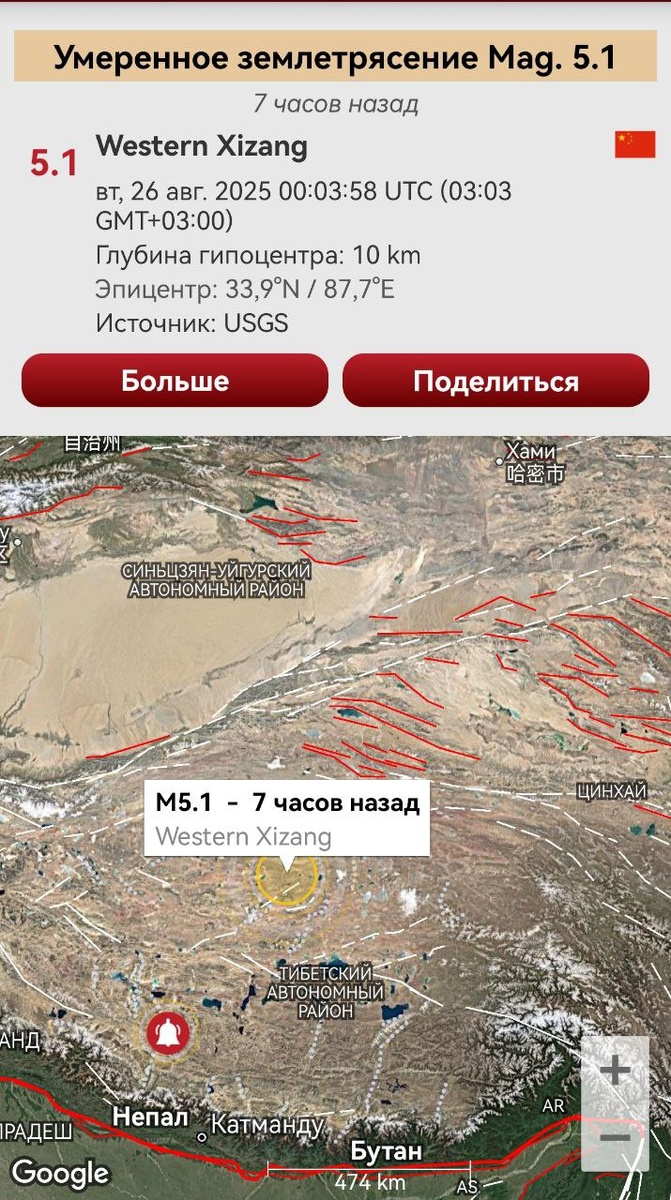 Похоже, что под напряжением находится Тибет. Землетрясение М5 сегодня уже произошло (фото 1), при этом 23 августа наблюдался ОСТИ уровня М6, трассирующий Altyn Tagh fault zone (фото 2-3). Вчера вечером по этой же рифтовой зоне наблюдался ОСТИ уровня М6 уже юго-западнее (фото 4-6) ====== It seems that Tibet is under tectonic tension. The M5 earthquake has already occurred today (photo 1), while on August 23, a CSTI of the M6 level was observed, tracing the Altyn Tagh fault zone (photo 2-3). Last night, a CSTI of the M6 level was observed along the same rift zone already southwest (photo 4-6)