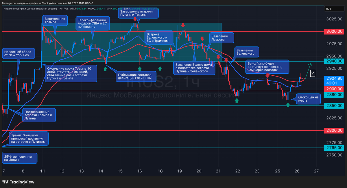 Российский рынок акций вчера на протяжении почти всего дня снижался, но в 16:00 произошел разворот. Внутри дня были частые и резкие развороты на новостном шуме. Индекс МосБиржи обновил минимум прошлой недели, но не дошёл до уровня поддержки 2850 пунктов, о котором я писал ранее. Минимум дня – 2858 пунктов. Таким образом, индекс МосБиржи после роста более чем на 10%, скорректировался на 5%. На рынке такое бывает, что не нужно причин для разворота. Всё просто, спрос превысил предложение. К тому же, скорее всего снижались всё это время на сокращении плечей участников, которые набирали их под быстрое завершение конфликта. С другой стороны, цены на нефть могли послужить катализатором. После консолидации около $65 за баррель, нефтяные котировки выросли до $69 за баррель. Более того, курс доллара по отношению к рублю закрепился выше 80 руб., что в свою очередь положительно скажется на результатах компаний за III кв. 2025 г. На фоне этого я вчера возобновил покупки в акций в среднесрочный порт