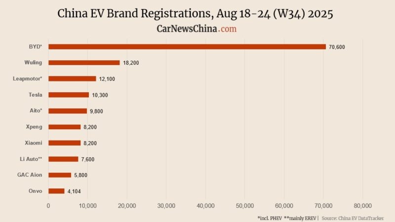 На третьей неделе августа 2025 года китайский рынок электромобилей вновь удивил: BYD и Xiaomi наращивают темпы, а Tesla неожиданно теряет долю. Подробная статистика регистраций и анализ тенденций — в нашем материале. Китайский рынок электромобилей продолжает удивлять динамикой: в третью неделю августа 2025 года (с 18 по 24 августа) сразу несколько брендов показали заметный рост регистраций, а некоторые, напротив, столкнулись с падением. В центре внимания оказались BYD, Tesla, Xpeng, Xiaomi и другие крупные игроки. Лидером недели вновь стал BYD, зарегистрировавший 70 600 новых электромобилей. Это на 8,3% больше, чем неделей ранее (65 200 машин), но почти на 20% меньше, чем в аналогичный период прошлого года. За первые три недели августа BYD поставил на учет 190 600 автомобилей, что подтверждает его статус крупнейшего производителя электромобилей в Китае. Leapmotor также порадовал поклонников: 12 100 регистраций за неделю, что на 16,3% больше, чем неделей ранее, и почти вдвое больше прош