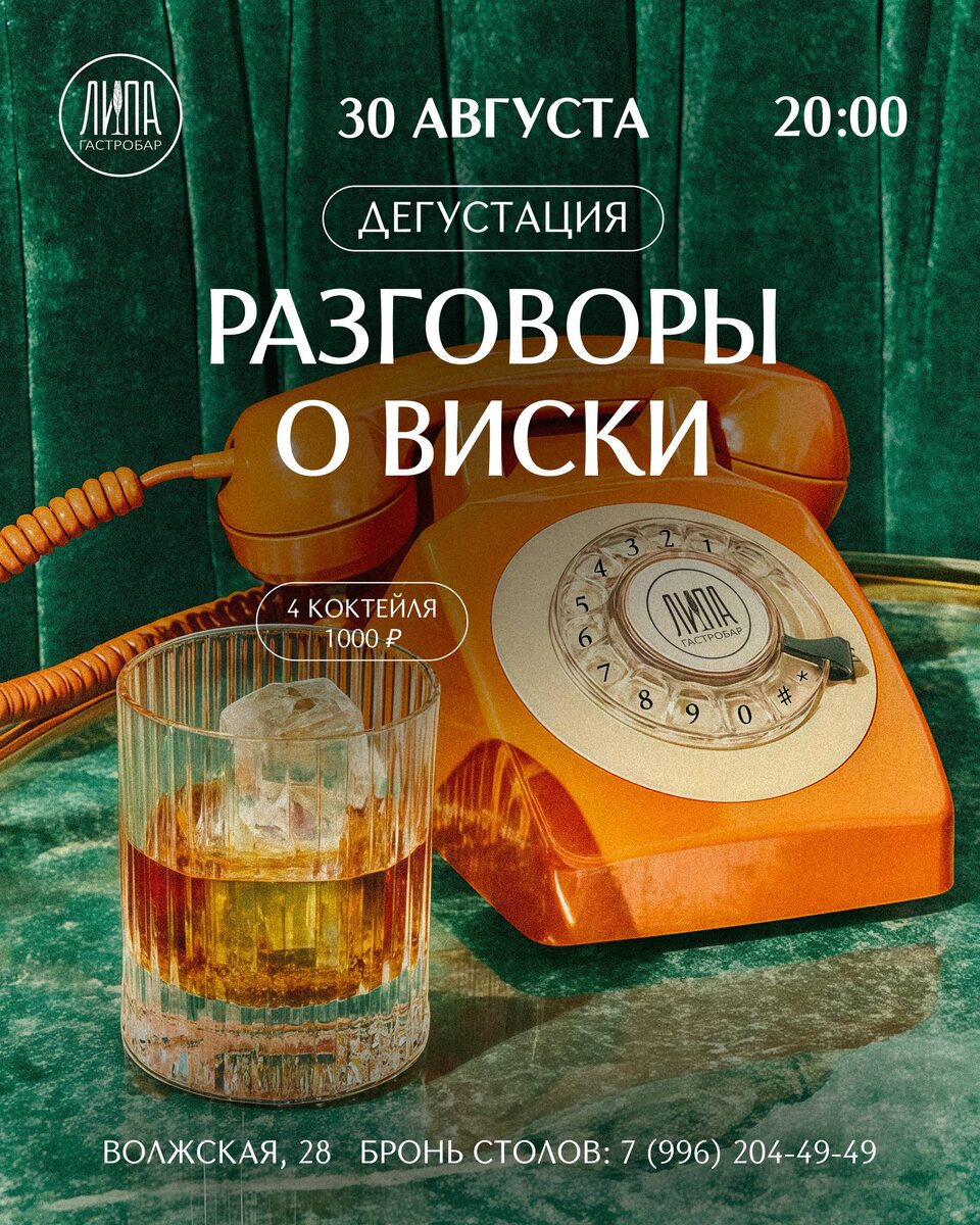 Вечер для тех, кто любит вкусные истории ✨ В эту субботу мы собираем гостей на дегустацию «Разговоры о виски». Что будет? 4 авторских коктейля на основе виски и лёгкая беседа о его характере, ароматах и секретах. Стоимость участия — 1000₽. Начало — 20:00. Атмосфера уютного вечера, напитки с историей и тёплая компания ждут вас в «Липе». Бронь столов: +79962044949