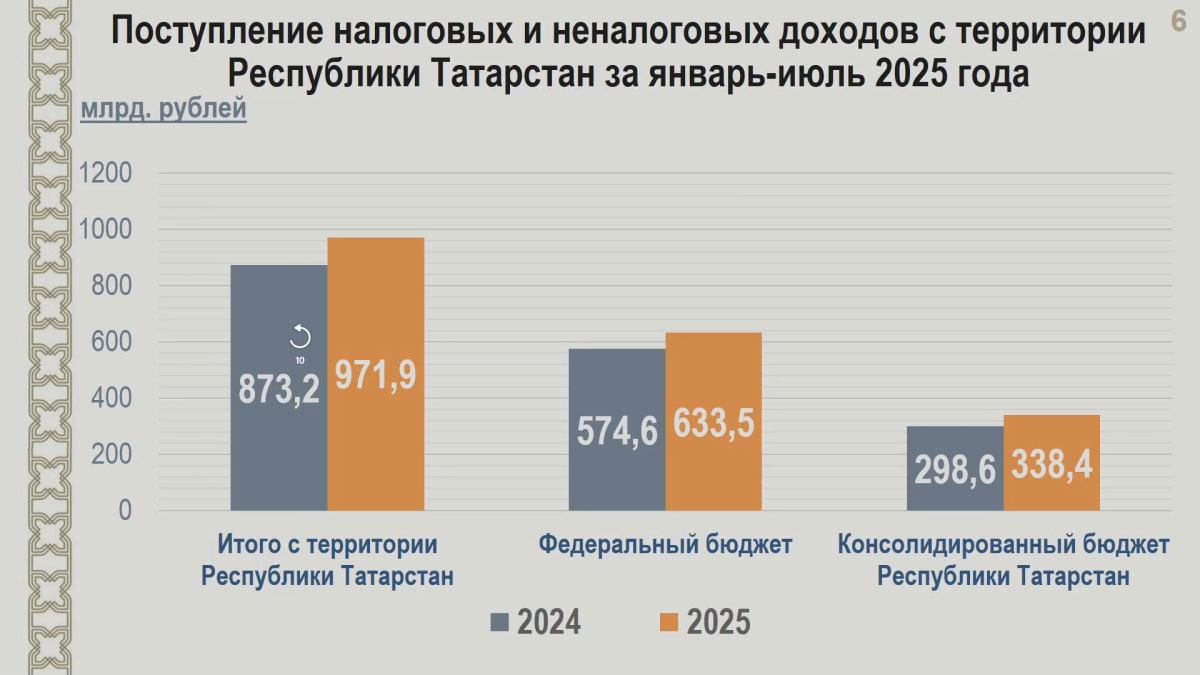 Автор: Динара Прокопьева С начала 2025 года поступления в консолидированный бюджет Татарстана выросли на 13% и составили 338,4 млрд рублей. Такие суммы назвала заместитель министра финансов республики Алла Анфимова на пресс-конференции в «Татар-информе». «Относительно аналогичного периода прошлого года поступления в консолидированный бюджет республики выросли на 39,8 млрд рублей, или на 13%», – сказала замминистра. По словам Анфимовой, к 1 августа с территории республики мобилизовали 971,9 млрд рублей налоговых и неналоговых доходов – рост на 11%. Мобилизация доходов – это мероприятия, направленные на дополнительное привлечение доходов в бюджет. Из общей суммы мобилизованных доходов 65% направили в федеральный бюджет, а 35% – в консолидированный бюджет республики. Среди основных источников доходов консолидированного бюджета РТ с января по июль этого года – налог на доходы физических лиц (33%), налог на прибыль (26%) и неналоговые доходы (12%). По объему мобилизованных доходов бюджета р