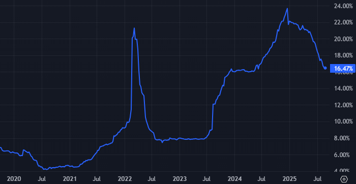 Это единственный срок в диапазоне 3–36 месяцев, где доходность стала однозначной, говорится в сообщении сервиса. Индикатор стоимости обеспеченных денег RUSFAR3M «В августе 2025 года средняя ставка по трехлетним вкладам в топ-20 российских банков снизилась до 9,75% годовых, с 10,06%. Это единственный срок в диапазоне 3–36 месяцев, где доходность стала однозначной, по данным Финуслуг», — говорится в сообщении сервиса. Эти данные касаются вкладов на 100 тыс. руб. без спецусловий, а разброс ставок по ним находится в диапазоне 5,7%-18,5%. «…по вкладам от трех месяцев до двух лет средние ставки остаются выше — от 11,12% до 15,83%. Длинные вклады не очень популярны среди населения. Наибольшие доходности предлагает трехмесячный депозит (15,83%). Однако трехлетние вклады доступны не во всех банках: их предлагают только 14 из 20», — сообщают Финуслуги. Индикатор стоимости обеспеченных денег RUSFAR3M предполагает, что в ближайшие три месяца ключевая ставка Банка России опустится до 16,5% (см. гра