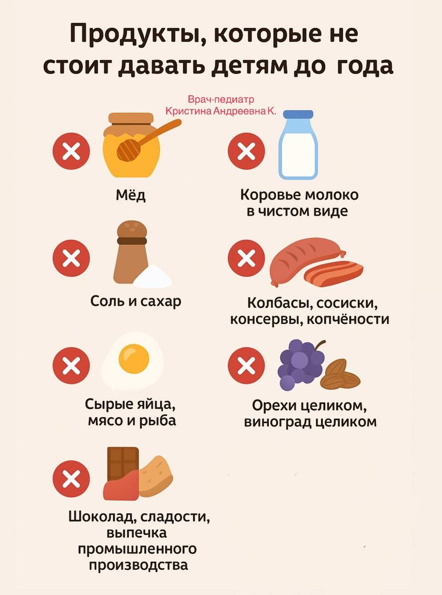 Продукты, которые не рекомендуется давать детям до 1 года ➖➖➖➖➖➖➖➖➖ 👇Что точно не стоит давать из продуктов до года : ❣️Мёд – даже в минимальных количествах может содержать споры Clostridium botulinum и вызвать ботулизм. Мед лучше не давать детям до 3 лет. ❣️Коровье молоко в чистом виде – из-за высокой нагрузки на почки и риска дефицита железа. Допустимо только использование адаптированных молочных смесей. Каши на молоке тоже желательно после года. ❣️Соль и сахар – лишняя нагрузка на почки и поджелудочную железу, формирование неправильных вкусовых привычек. ❣️Колбасы, сосиски, консервы, копчёности – содержат избыточное количество соли, специй, жиров и пищевых добавок. Думаю , это и так всем понятно) ❣️Сырые яйца, мясо и рыба – высокий риск заражения сальмонеллёзом, листериозом и другими инфекциями. Яйца обязательно нужно готовить до полной готовности - обращайте на это внимание . Всмятку яйца не подойдут для питания детей. ❣️Орехи целиком , виноград целиком, попкорн и другие твё