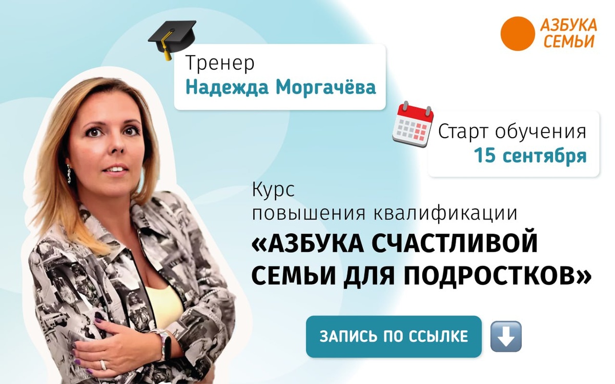 Родители приходят в отчаяние, а нам порой не хватает не теории, а конкретного плана и инструментов, которые работают со всей семейной системой. ❓Что, если у вас был бы такой план? Предлагаем вам пройти курс повышения квалификации «Азбука счастливой семьи для подростков». В результате вы сможете эффективно работать в групповом формате с ребятами 14-17 лет, включая детей с девиантным поведением, а также станете поддержкой для их родителей на пути изменений к лучшему. Все это станет возможно благодаря системе, которую вы после обучения внедрите в свою практику. Вашим проводником на пути внедрения нового подхода станет Надежда Моргачева, полимодальный супервизор, психолог и тренер с 13-летним опытом работы с подростками и взрослыми. 📚 Методы и подходы работы тренера: ✔️ Когнитивно-поведенческая терапия детей и подростков (КПТ) ✔️ Терапия тревожных расстройств и ПТСР ✔️ EMDR-терапия ✔️ Ненасильственное общение (М.Розенберг) и позитивная психология (М.Селигман) "Для меня в работе с лю