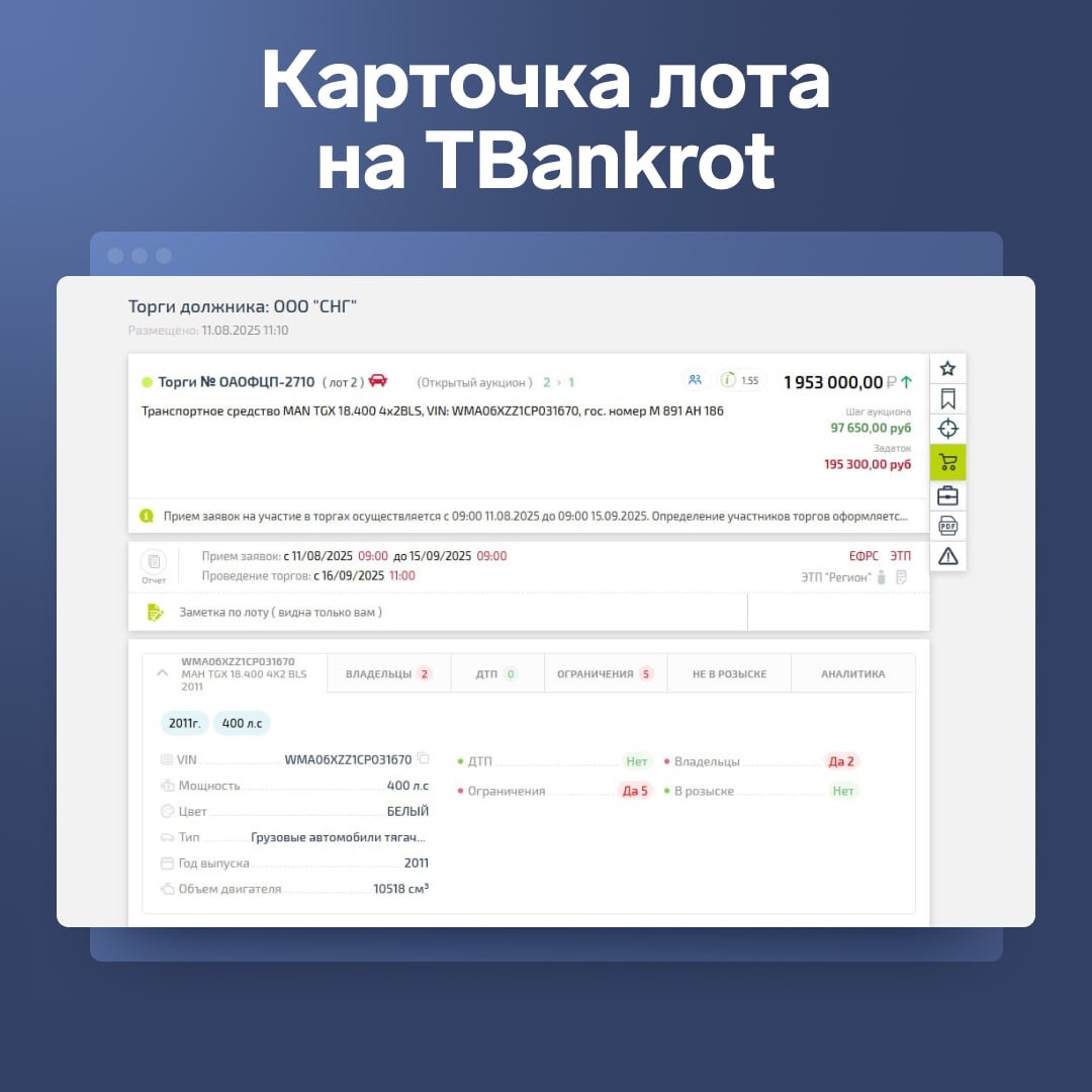 Меня сложно найти, легко потерять... Так шепнул нам этот лот, когда мы увидели его на ЕФРСБ. Описание лота: «Дополнительную информацию об имуществе и порядке ознакомления с ним можно получить по тел. 8 (914)*** или по e-mail 1345ab@*** в период приёма заявок» >> https://clck.ru/3NroNm Заманчиво? Скорее пролистнёте. А зря — под этой пустышкой прятался седельный тягач MAN TGX 18.400: https://clck.ru/3NroMh Поиск по названию на ЕФРСБ его не находит. И это не редкость: примерно в 8% из всех лотов наш искусственный интеллект обнаруживает неточности в информации, которая поступает с ЭТП и ЕФРСБ. Сколько выгоды можно потерять. Не порядок! Что делать? Искать лоты на TBankrot. Исправлению ошибок мы уделяем особое внимание — все лоты проходят двойную проверку. Сначала искусственный интеллект сервиса анализирует каждый лот на ошибки и редактирует их. Затем модераторы перепроверяют лоты. Итог: вы сможете найти такое имущество и по ключевому слову, и по категории. 🔍 Попробуйте сами: зайдит