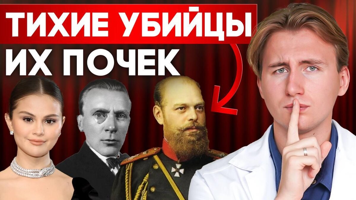 ⚡️Это убило почки Булгакова, Александра III и Селены Гомес. КАК не стать СЛЕДУЮЩЕЙ жертвой? Булгаков, Селена Гомес, император Александр III, Николай Расторгуев - что может объединять писателя, поп-звезду, царя и рок-музыканта? Общее - в диагнозе, о котором они даже не знали или о котором молчали. Хроническая болезнь почек уже обогнала большинство диагнозов и к 2040 году выйдет в тройку самых частых причин смерти в мире. Что сотню лет назад, что сейчас болезнь себя не проявляет почти до самого конца. И если не знать простых шагов профилактики - можно повторить судьбу гениев и императоров. В этом видео: 🔻Почему Александр III, вытащив пассажиров из-под обломков, подписал приговор своим почкам 🔻Почему Булгаков знал, что умирает от почек, но не мог себе помочь 🔻Как Селену Гомес спасла подруга и какой ценой ей далась борьба со своей болезнью 🔻Как современная медицина могла бы им всем помочь? 📱 Смотреть ролик на Ютуб 📱 Видео также появилось в моей группе ВК