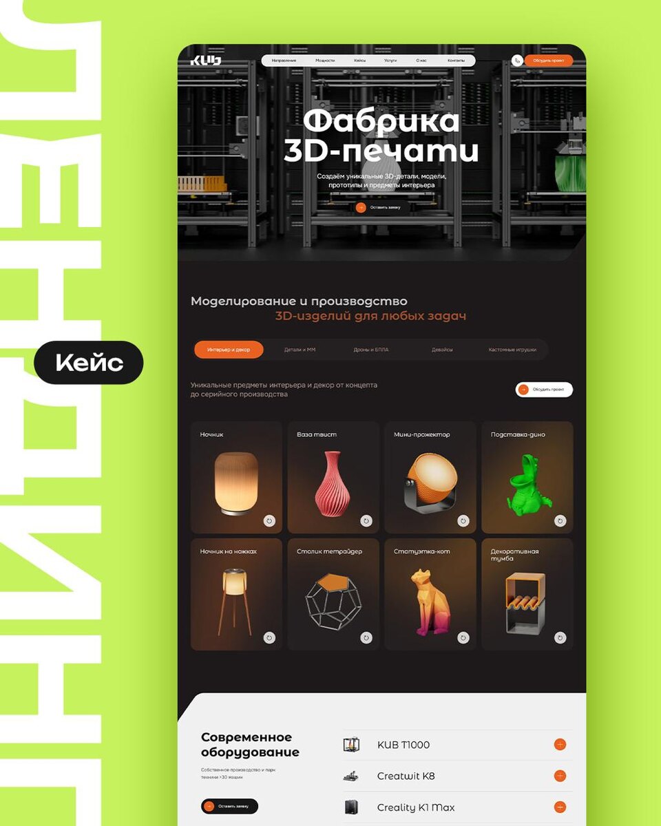 Когда технологии встречают стиль Новый кейс: лендинг для фабрики 3D-печати Сделали лендинг, который не просто показывает 3D-печать, а оживляет её: 💚Минималистичный эстетичный дизайн, подчеркивающий ценности фабрики 💚3D-визуализации, которые мы отрисовали специально для этого проекта 💚Мягкие и стильные анимации. Не разражающие, а цепляющие и вовлекающие А ещё именно этому проекту мы доверили своё участие в конкурсе «Рейтинг Рунета» в номинации «Одностраничный сайт» Заходите на 3dprint-russia.ru и почувствуйте наш технологичный вайб ☕️ #кейс #лендинг