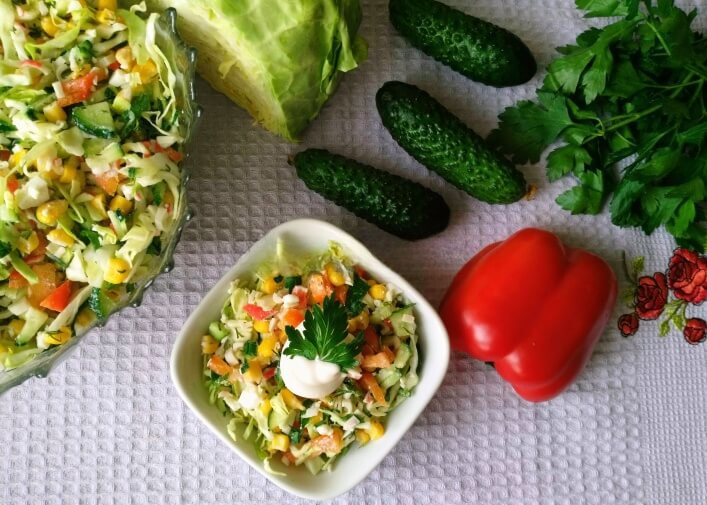 2. Лучше использовать пекинскую или молодую белокочанную капусту — она более нежная. Нашинкуйте ее очень тонко и добавьте к кукурузе.