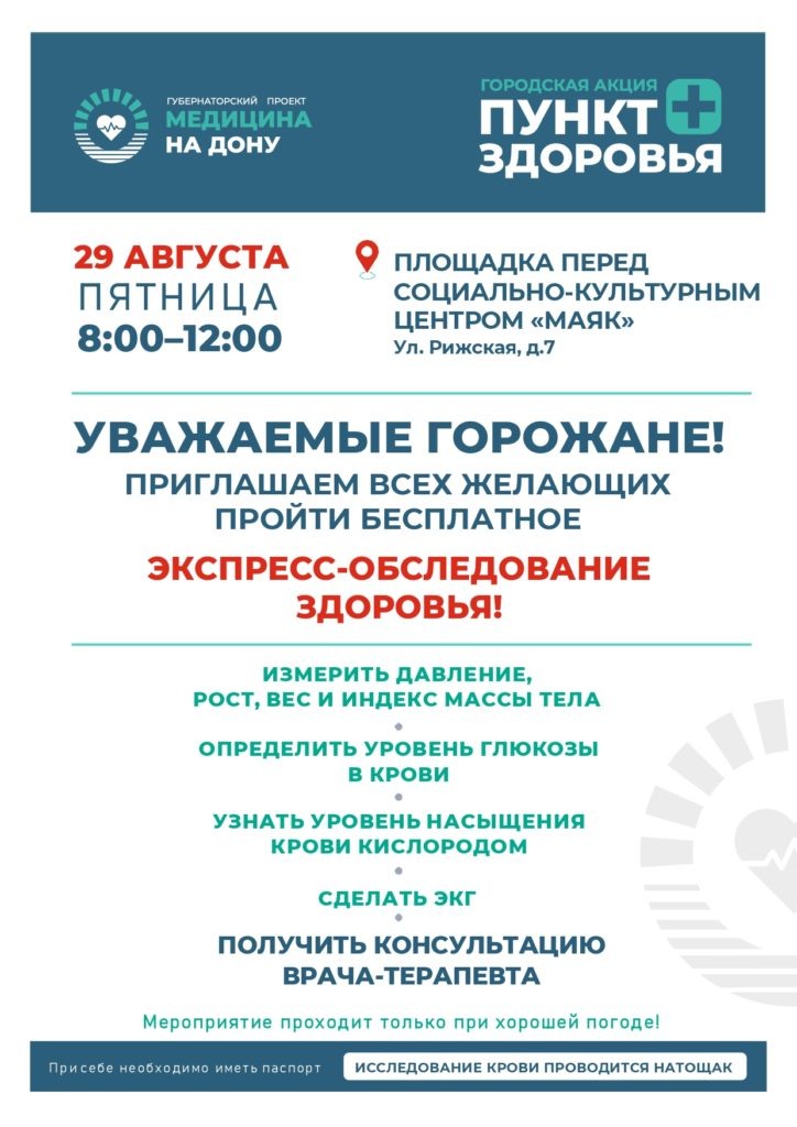 В рамках губернаторского проекта «Медицина на Дону» любой желающий сможет пройти бесплатный чекап 29 августа с 08:00 до 12:00 на площади социально-культурного центра «Маяк»Обследование включает: