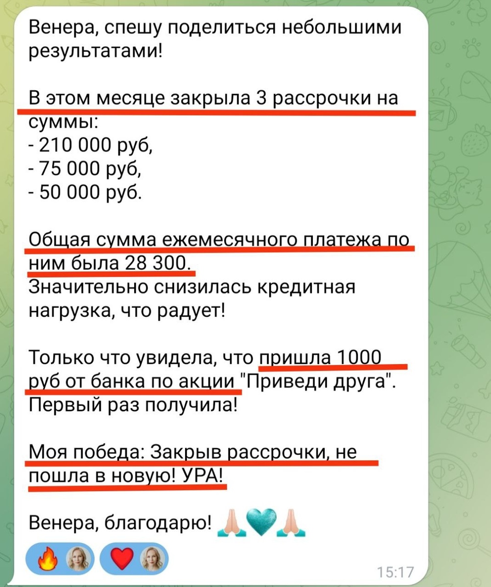 Закрыла 3 рассрочки за последний месяц Сегодня созванивалась со своей клиенткой и она поделилась своими успехами по закрытию долгов Меня это очень радует, потому что я тоже приложила к этому руку🥰 Делюсь ее успехами с вами За последний месяц она закрыла 3 рассрочки с общей задолженностью больше 300к Теперь у нее +28к в кармане каждый месяц — именно столько составлял ежемесячный платеж Очень ее понимаю, потому что сама тоже недавно закрыла одну рассрочку и с облегчением вдохнула) Классно, когда никому ничего не должен😉 Особенно радостно, что после закрытия рассрочек моя клиентка не пошла в новую рассрочку, а спокойно взвесила нужна ли ей сейчас эта покупка или есть смысл рассмотреть ее попозже, когда кредитная нагрузка станет еще меньше Как видно из скрина, Вселенная моментально вознаградила ее за осознанность и она получила 1000 руб. по акции банка — мелочь, а приятно🤗 ❓А как у вас обстоят дела с долгами? Хотите узнать как ей это удалось? ➡️Пишите мне в личку @Veneraprognoz