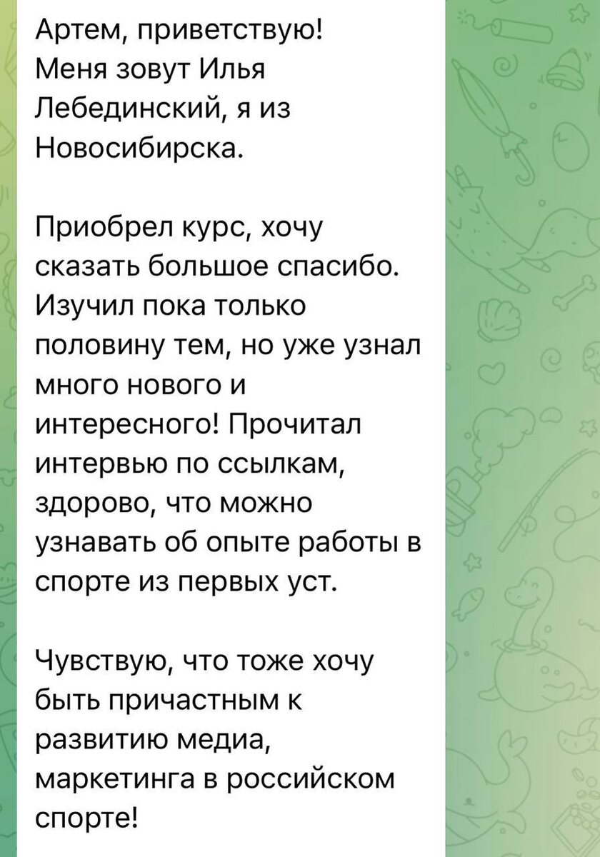 В ответ на пост Редко, но делюсь здесь опытом запуска своего мини-курса ПРО маркетинг в спорте. Недавно получил такой отзыв. Их уже довольно много из почти 300 покупок, все их публикую на странице курса. Но каждый раз это безумно вдохновляет и мотивирует идти дальше. Чтобы помогать людям погрузиться в индустрию спорта и попасть в него. К счастью, это получается делать. Что по стажировкам в рамках мини-курса. Девять человек с первой волны попали на стажировки в топ-клубы. Трое из них уже работают. До 1 сентября есть шанс попасть в ХК «Трактор», ФК «Крылья Советов», ФК «Амкар», ХК «Автомобилист». В свое время у меня таких шансов не было, все строил сам, с нуля. Но хочу, чтобы они были у тех, кто любит спорт и хочет в нем реализоваться. ПРО маркетинг в спорте