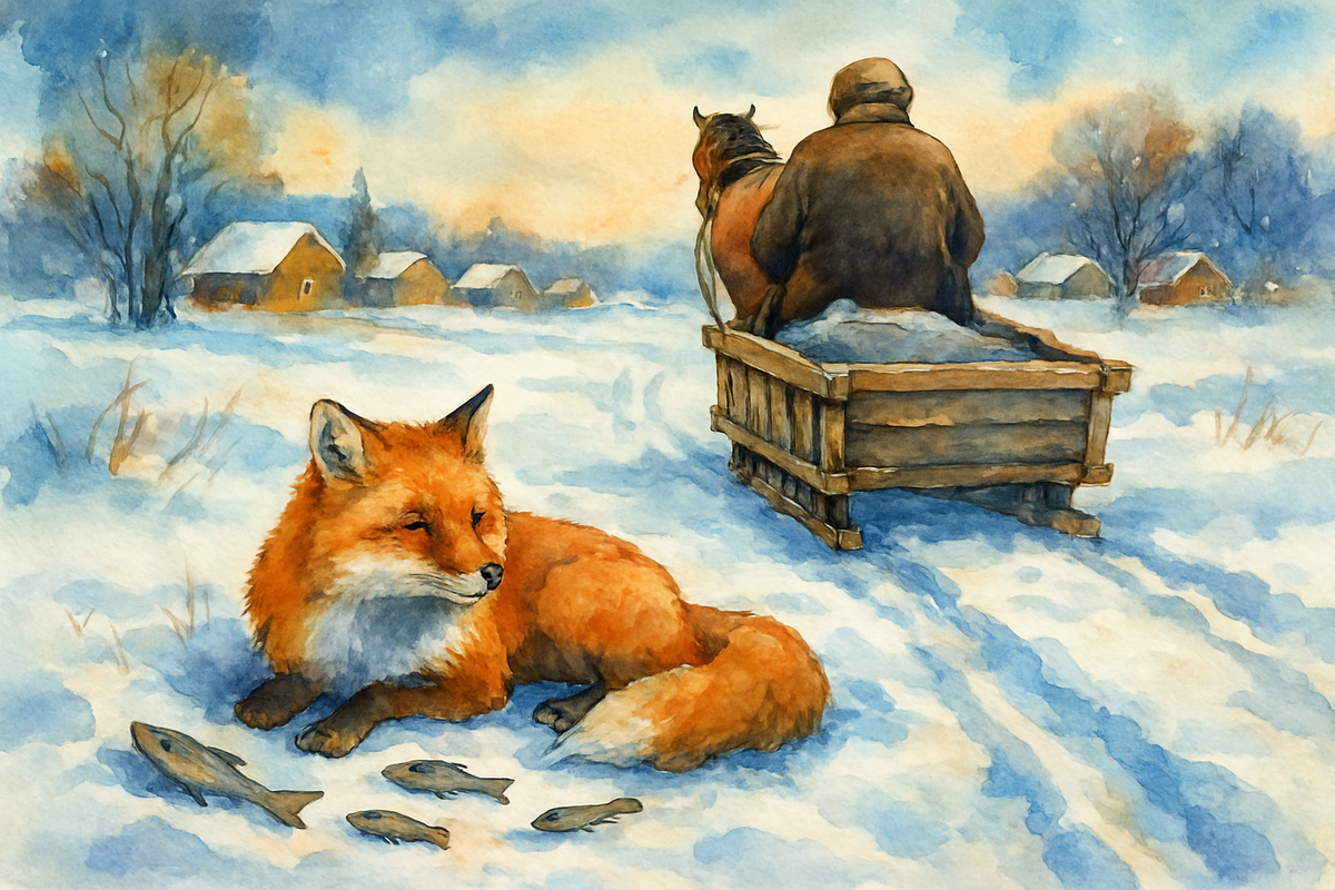 — Вот будет подарок жене, — сказал дед, взял лисичку и положил на воз, а сам пошёл впереди. А лисичка улучила время и стала выбрасывать полегоньку из воза всё по рыбке да по рыбке, всё по рыбке да по рыбке. Повыбросала всю рыбу, и сама ушла.