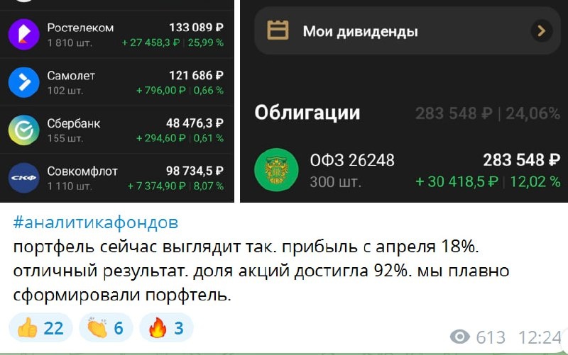 ‼️Многие у нас придирались к отдельным торговым идеям моим или управляющих фондами. Чтобы показать эффективность торговли одним из управляющих был заведён портфель "Степаныч", открытый как небольшой пенсионный портфель для отца. 📈Данный консервативный портфель ведётся с апреля месяца и сейчас в плюсе на 18%. Кто за этим всем наблюдает знают, что портфель рос даже на падении рынка, хотя ведётся от лонга. Всё дело в правильном подборе бумаг. И да у настоящих инвесторов не бывает так чтобы абсолютно все идеи в плюс, но при правильном ведении портфеля он чувствует себя как сумма торговых идей великолепно. Сегодня там была открыта новая торговая идея. Многие каналы копируют наши идеи, но лучше смотреть всегда на первоисточник. ☝️Полный портфель же и все сделки от управляющего крупным фондом по нему и мои в реальном времени в нашем инвесторском клубе: 👉 https://t.me/SubProfitGateBot