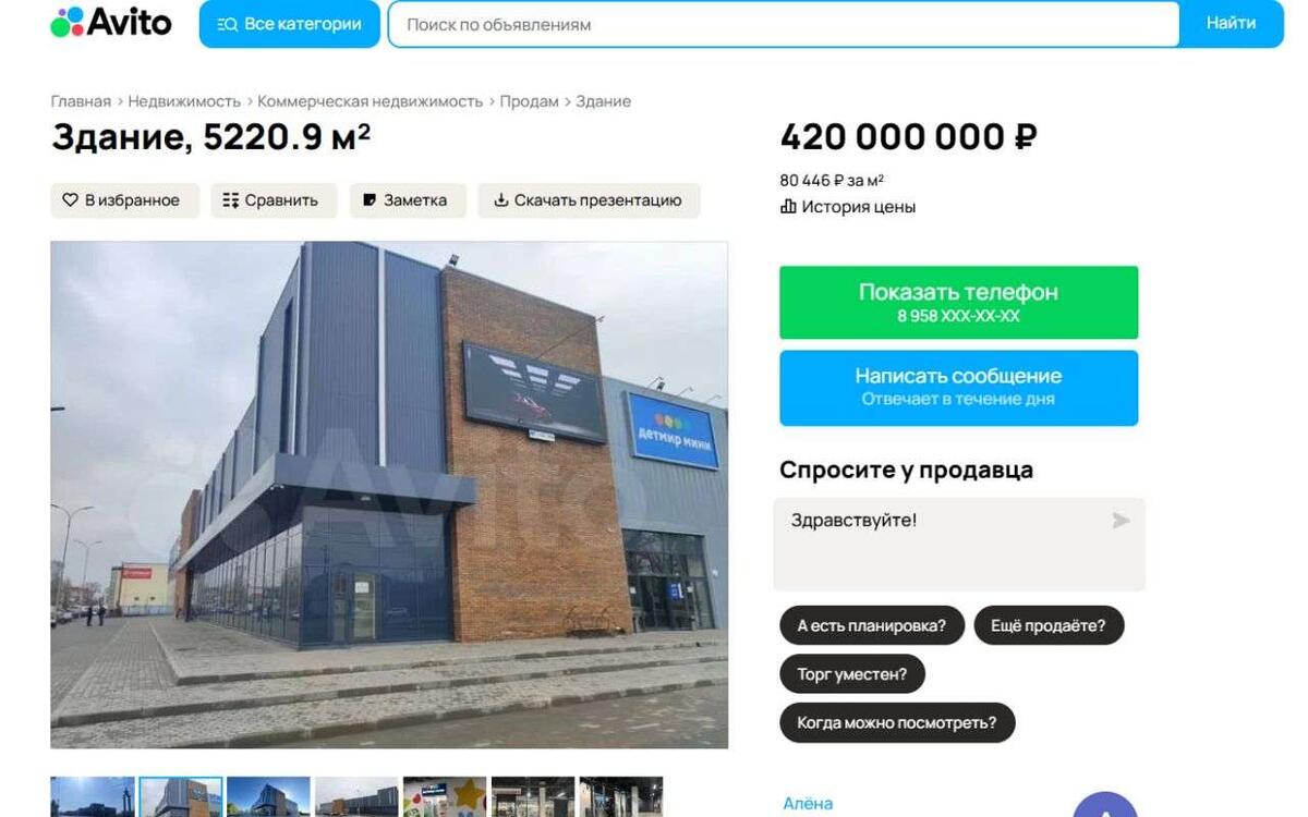 В Боброве Воронежской области выставили на продажу 2-этажный торговый центр «Ермак» на улице 22 Января, 104. Согласно размещенной в понедельник, 25 августа, на сайте объявлений «Авито» информации, объект недвижимости оценили в 420 млн рублей. – Здание оснaщeно импоpтными эскaлатopами и лифтами для удoбства пocетителeй, чтo делaeт егo пpивлeкaтельным для вcеx кaтeгоpий посетителей, – отмечает собственник. Общая площадь торгового центра, который начал свою работу менее года назад, составляет 5220,9 кв. м. На данный момент, как подчеркивается в объявлении, 75% помещений сданы в аренду различным компаниям, в числе которых есть федеральные и региональные торговые сети.