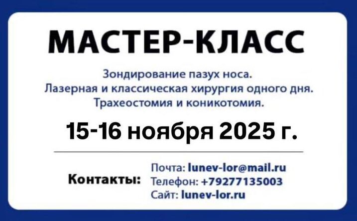📌 Количество участников ограничено — до 10 человек для обеспечения высокого качества обучения. Отоларинголог, лор-хирург Лунёв Андрей Владимирович 📞 По всем вопросам обращайтесь к организатору мероприятия: подробности