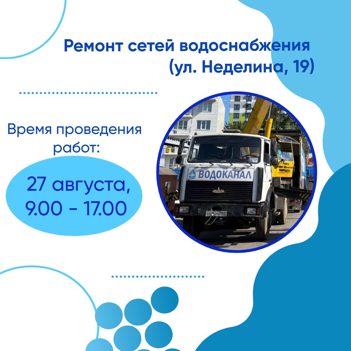 ΠΎΠ»ΠΎΠ΄Π½ΠΎΠ΅ Π²ΠΎΠ΄ΠΎΡΠ½Π°Π±ΠΆΠ΅Π½ΠΈΠ΅ ΠΏΠΎ Π°Π΄ΡΠ΅ΡΠ°ΠΌ: β‘οΈ ΠΏΡ-Ρ. 60 Π»Π΅Ρ ΠΠΊΡΡΠ±ΡΡ, Π΄.1, Ρ1Π, 2, 2Π, 2Π, 2Π, Ρ2Π, 3, 4, 5, 6, 7, 8, 9, 9Π°, 10, 11, 11Π°, 13, 15, 17; β‘οΈ ΡΠ». ΠΠ΅Π΄Π΅Π»ΠΈΠ½Π°, Π΄.1, 1Π, 1Π, 2, 2Π, 2Π, 3, 4, 5, 6, 7, 9, 9Π, 10, 11, 12, 13, 15, 15Ρ1, 16, 16Π, 17, 18, 18Π, 19, 20, 21, 22, 23, 24, 25, 25Ρ1, 26; β‘οΈ ΡΠ». ΠΠ΅Π΄Π΅Π»ΠΈΠ½Π°, Π΄.8 Π‘ΡΠ΅Π΄Π½ΡΡ ΠΎΠ±ΡΠ΅ΠΎΠ±ΡΠ°Π·ΠΎΠ²Π°ΡΠ΅Π»ΡΠ½Π°Ρ ΡΠΊΠΎΠ»Π° β 10; β‘οΈ ΡΠ». ΠΠ΅Π΄Π΅Π»ΠΈΠ½Π°, Π΄.7Π ΠΠ΅ΡΡΠΊΠΈΠΉ ΡΠ°Π΄ β32 Β«Π ΠΎΡΠΈΠ½ΠΊΠ°Β» ΠΊΠΎΡΠΏΡΡ β1; β‘οΈ ΠΏΡ-Ρ. 60 Π»Π΅Ρ ΠΠΊΡΡΠ±ΡΡ, Π΄.12Π ΠΠ΅ΡΡΠΊΠΈΠΉ ΡΠ°Π΄ β32 Β«Π ΠΎΡΠΈΠ½ΠΊΠ°Β» ΠΊΠΎΡΠΏΡΡ β2; β‘οΈ Π©Π΅Π»ΠΊΠΎΠ²ΠΎ-7 ΡΠ΅ΡΡΠΈΡΠΎΡΠΈΡ Π±Π°Π·Ρ ΠΠΠΠ Β« ΠΡΠ±ΡΒ»; β‘οΈ Π©Π΅Π»ΠΊΠΎΠ²ΠΎ-7 ΡΠ΅ΡΡΠΈΡΠΎΡΠΈΡ ΠΠ§ 26188; β‘οΈ Π©Π΅Π»ΠΊΠΎΠ²ΠΎ-7 Π¦Π’Π β.1, Π¦Π’Π β.2, Π¦Π’Π β.3, Π¦Π’Π β.4. Π’Π΅Π»Π΅ΡΠΎΠ½ Π°Π²Π°ΡΠΈΠΉΠ½ΠΎ-Π΄ΠΈΡΠΏΠ΅ΡΡΠ΅ΡΡΠΊΠΎΠΉ ΡΠ»ΡΠΆΠ±Ρ Π²ΠΎΠ΄ΠΎΠΊΠ°Π½Π°Π»Π°: 84965621172. #Π©Π΅Π»ΠΊΠΎΠ²ΠΎ #ΠΠΎΠ΄ΠΎΠΊΠ°Π½Π°Π» #Π Π΅ΠΌΠΎΠ½ΡΠ’ΡΡΠ±ΠΎΠΏΡΠΎΠ²ΠΎΠ΄Π° #ΠΠΎΠ΄ΠΎΡΠ½Π°Π±ΠΆΠ΅