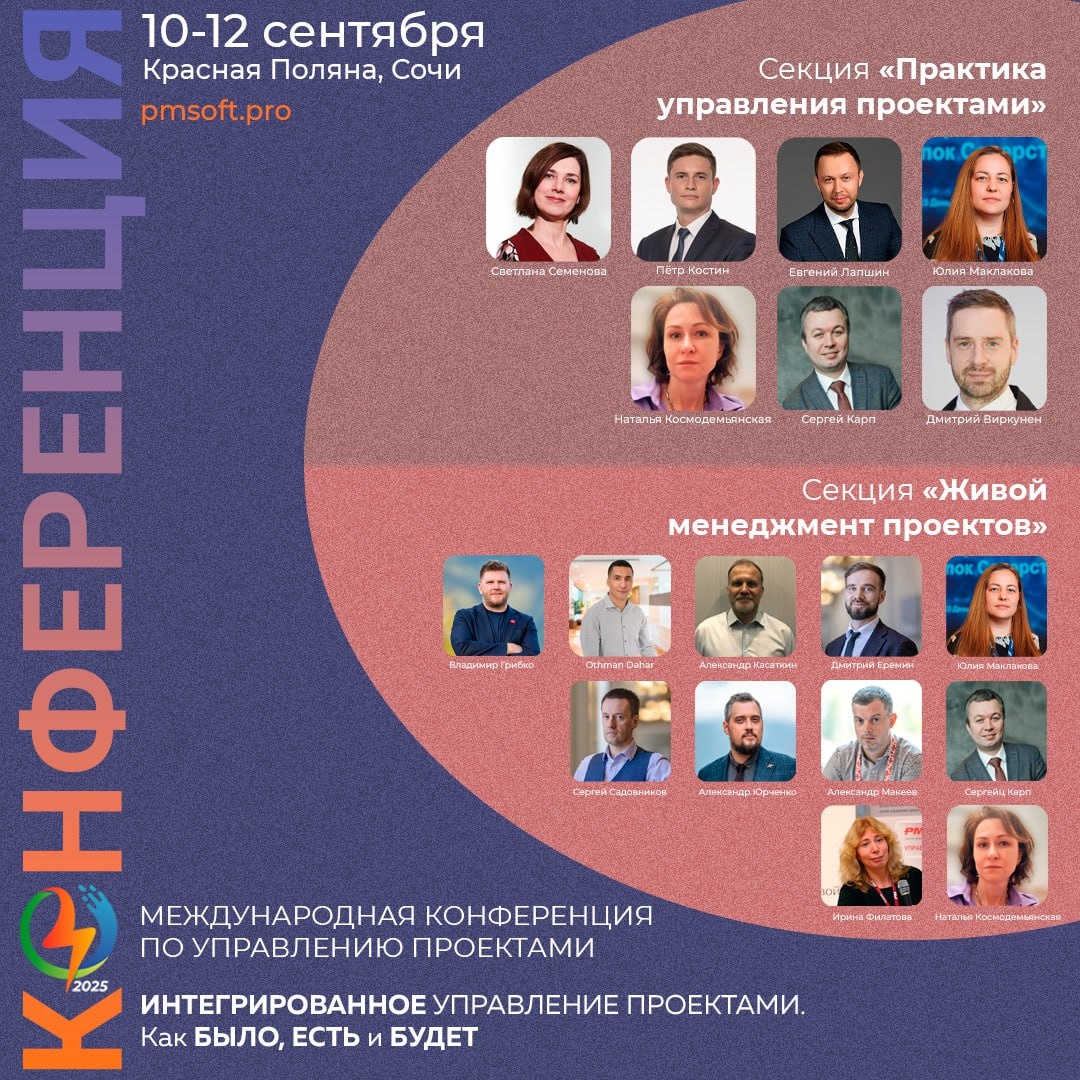 #ПроектнаяПятница Сочи, Красная поляна, 11 сентября 2025г. 💻 Практика. Проверенные решения. Живой диалог. Традиционно, уже в 24 раз, на конференции по управлению проектами пройдут, любимые участниками, две секции, которые стали визитной карточкой с первых лет проведения - и именно поэтому неизменно собирают самых вовлечённых слушателей. 📊 Секция «Практика управления проектами в России», в этом году речь пойдёт о том, что определяет качество реализации капитальных проектов сегодня: - о контрактных стратегиях в управлении строительством, - об использование больших языковых моделей ИИ для анализа и поддержки управленческих решений, - об умном планирование в проектных институтах, об интегрированном проектном контроле в промышленных холдингах, - и пр. Среди спикеров директора департаментов и руководители направлений, которые поделятся успешными кейсами и лучшими практиками из таких компаний как Корпорация «Атомстройкомплекс», АО «Апатит» (ФосАгро), АО «Северсталь Менеджмент»,