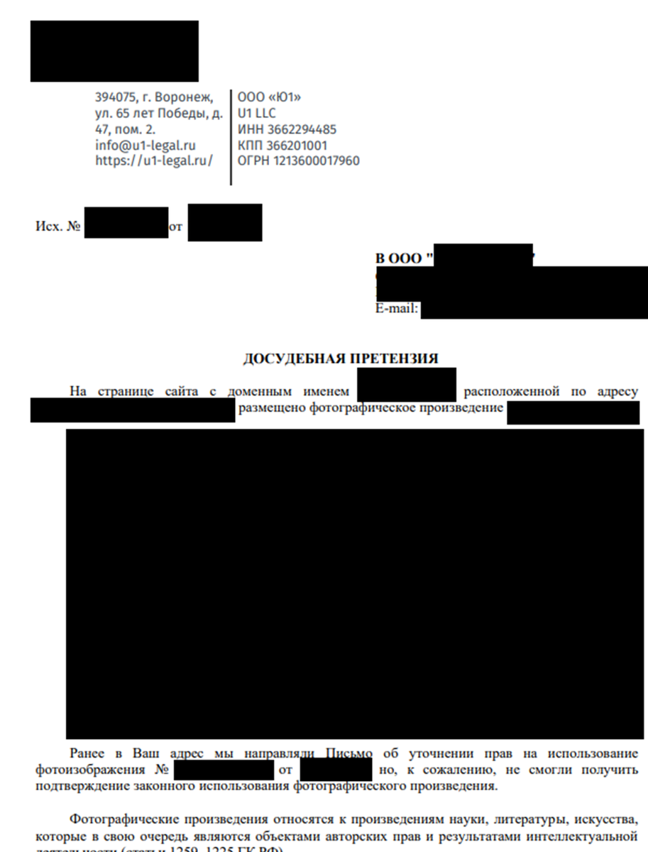 Таким образом, получение претензии или искового заявления от ООО "Ю1" свидетельствует о том, что эта компания зафиксировала факт неправомерного использования принадлежащего ей изображения в рамках деятельности Вашего интернет-магазина или веб-сайта.