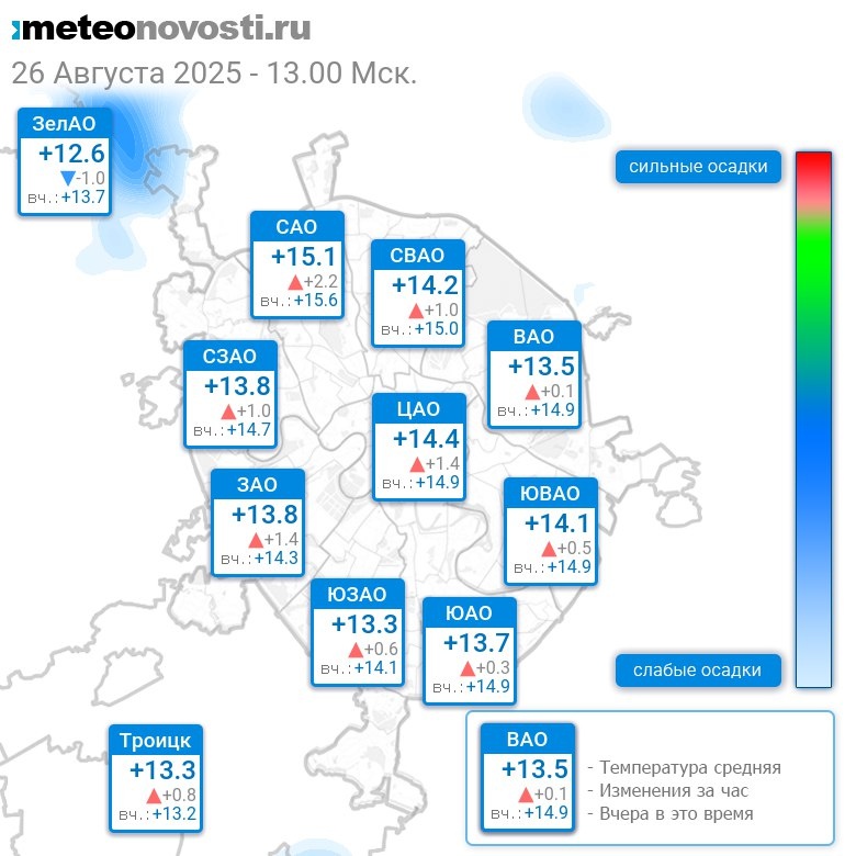 В 13:00 в Москве было от +12.4°C до +15.7°C, средняя температура +13.9°C #погода #Москва #лето #температура #26августа #вторник