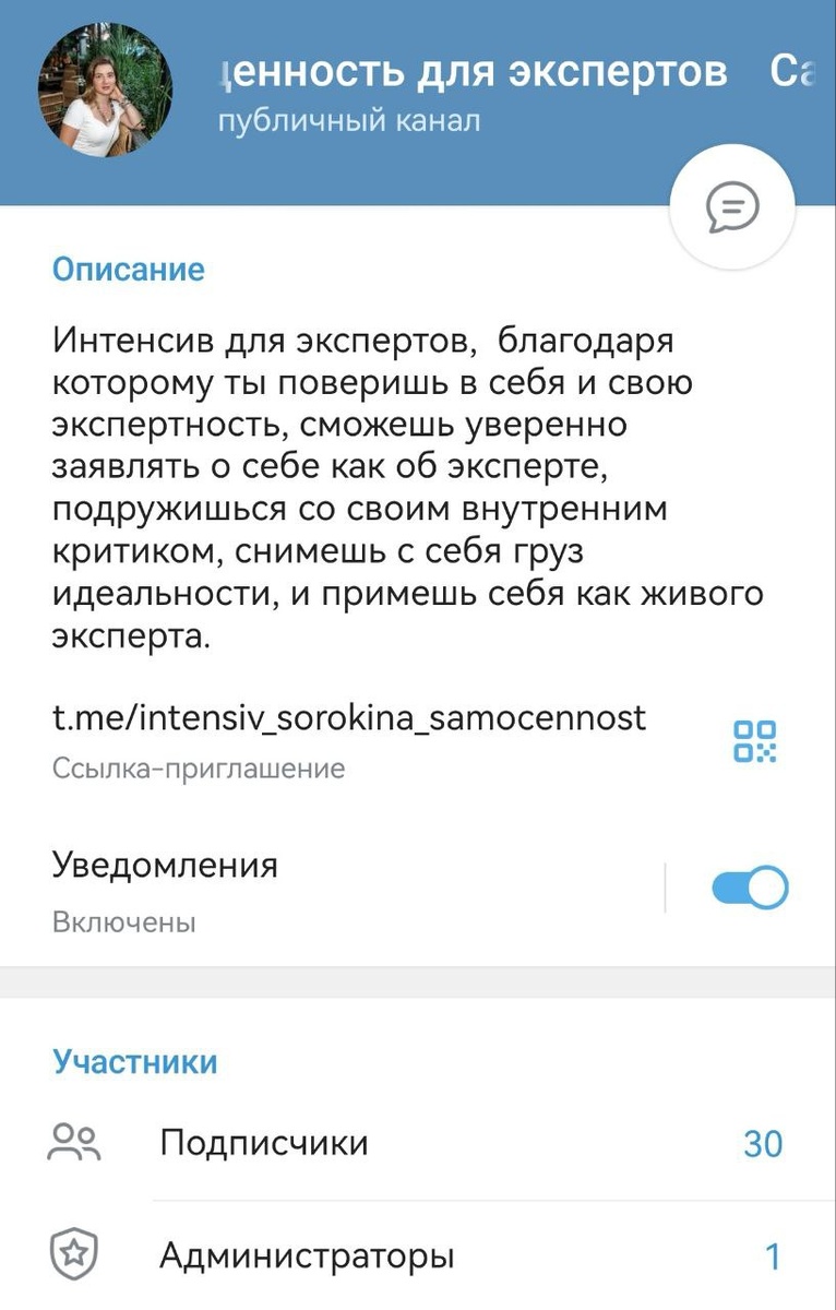 В ответ на пост Друзья, уже 30 человек зашли на интенсив Самоценности для Экспертов. Возможно и тебе стоит присоединиться? 💟💟💟 https://t.me/intensiv_sorokina_samocennost