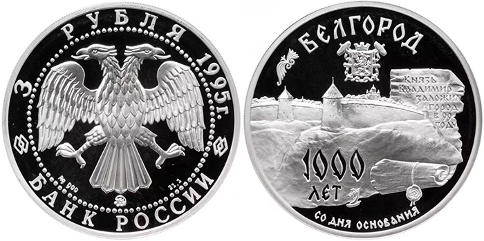 В монете "1000-летие основания г. Белгорода", входящей в эту серию, впервые было указано юбилейное событие. На реверсе монеты изображена белокаменная Белгородская крепость, не сохранившаяся до наших дней. Тематика монеты больше связана с историей города, чем с архитектурными памятниками. Серебряная монета, посвященная Белгороду, носящему звание "Город воинской славы", также вписывается в концепцию серии. На монете изображен герб города и его исторический объект.