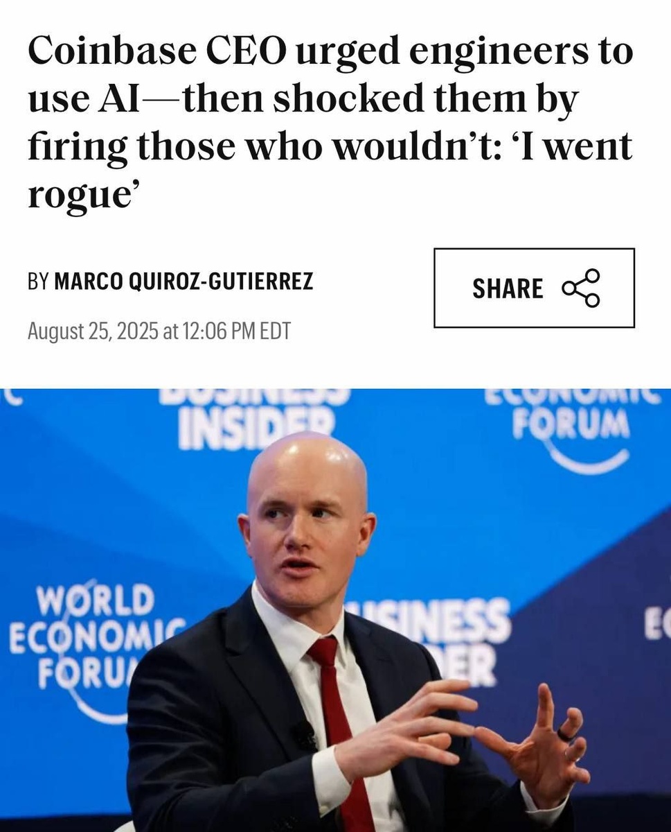Coinbase устроила принудительный апгрейд своим разработчикам: «Или начинаешь юзать ИИ-ассистента, или до свидания». 🤯 Непереобучившихся за неделю (Cursor, Copilot) — уволили. Жестко? По словам CEO Брайана Армстронга, необходимо. Теперь ИИ пишет уже треть кода в компании, а скоро будет половина. Кстати, сам Армстронг заявил, что тоже «часто использует ИИ на работе». Похоже, и для написания текстов ультиматумов тоже 😅 🤖 Ботоферма в деле!