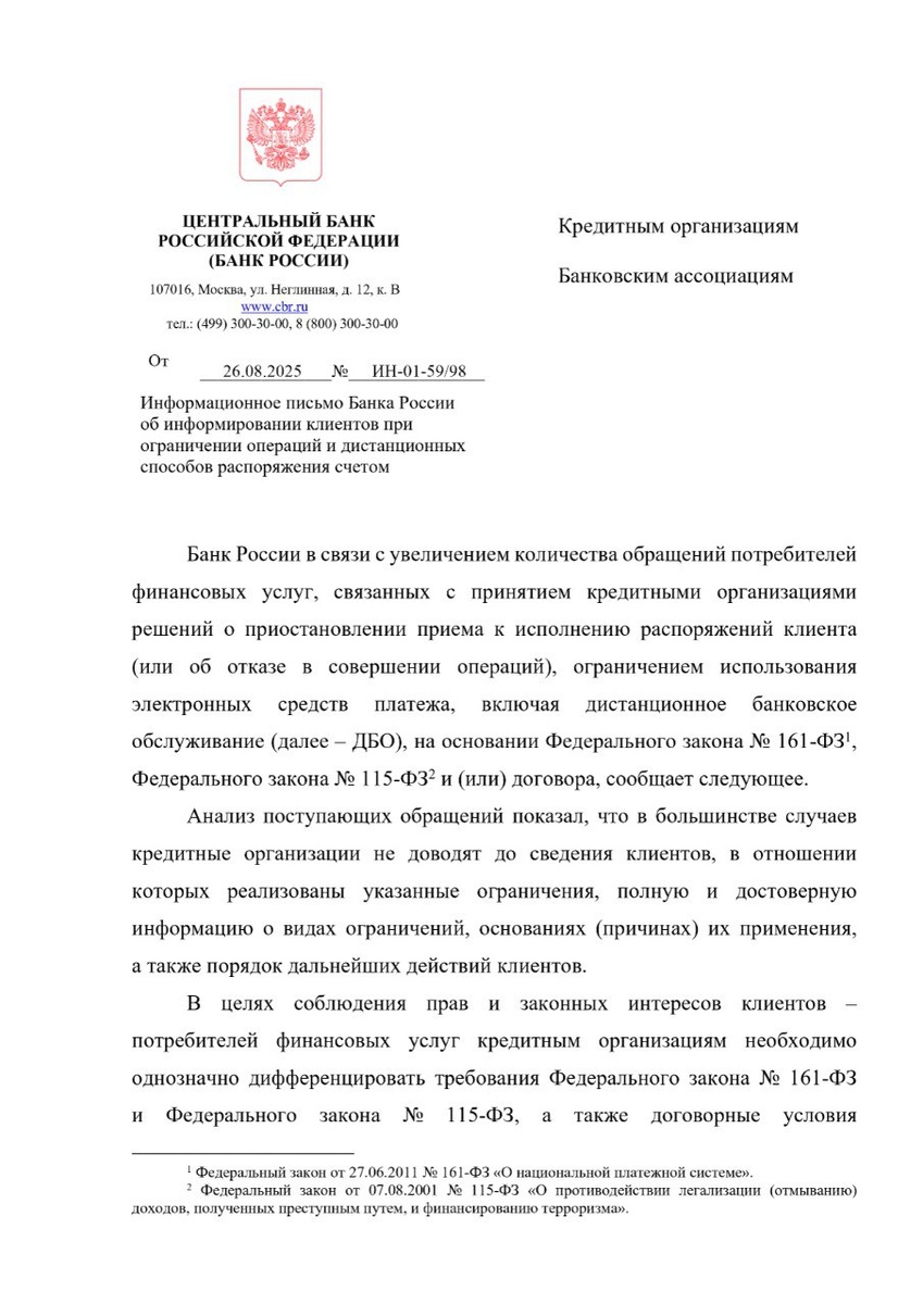 ЦБ в очередной раз выпустил письмо, в котором рекомендует банкам информировать клиентов и причинах блокировки счета по 161-ФЗ и 115-ФЗ. А также рекомендует банкам давать информацию о дальнейших действиях клиенту. Предоставлять клиентам полную и достоверную информацию, в частности, на основании какого именно федерального закона (со ссылкой на конкретную норму) и (или) условия договора кредитной организацией принято соответствующее решение, а также о причинах его принятия, порядке дальнейших действий клиентов в объеме, достаточном для реализации ими права на представление пояснений, информации и (или) документов в целях защиты своих прав в соответствии с законодательством Российской Федерации и права на возможное обжалование принятого кредитной организацией решения. Напомним, что это уже третье письмо ЦБ, где регулятор рекомендует банкам соблюдать законы и информировать клиентов о блокировках и порядке действий. Ранее были: 📌Информационное письмо Банка России от 5 июня 2024 г. № ИН