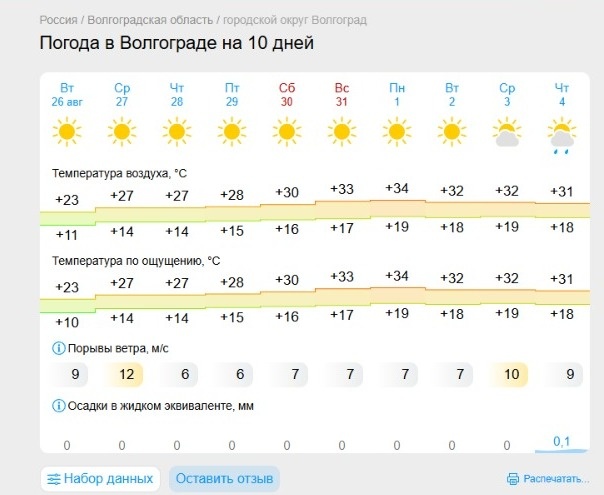 Ранее Волгоградской области прогнозировали понижение температуры до +3 градусов. Прохладными ожидались ночи на 26 и на 27 августа. Теперь в ночь на 27 августа прогнозируется до +5. Напомним, что мы писали про прощание с летом в Волгограде. В последние выходные в городе теперь ожидается температура еще выше, настоящая жара до +33. А 1 сентября — рекордные +34. Кстати, в эту пятницу по прогнозам до +28, температура продолжит стремительно набирать обороты до конца недели. И все же традиционно волгоградское 1 сентября сопряжено с обмороками у детей. Чаще всего — у первоклассников, у которых впервые в жизни наступает непростое утро: долгие сборы, волнение перед первой линейкой. Поэтому родителям стоит заранее подготовить головные уборы и воду.