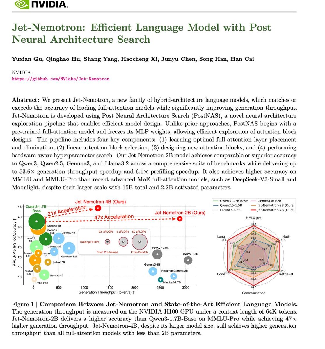 🚀 NVIDIA ускорила LLM в 53 раза 🤯 Представь: твой бюджет на инференс снижается на 98%, а точность остаётся на уровне лучших моделей. 📌 Как это работает: Метод называется Post Neural Architecture Search (PostNAS) — революционный подход к «апгрейду» уже обученных моделей. Freeze the Knowledge — берём мощную модель (например, Qwen2.5) и «замораживаем» её MLP-слои, сохраняя интеллект. Surgical Replacement — заменяем большую часть медленных O(n²) attention-слоёв на новый супер-эффективный дизайн JetBlock с линейным вниманием. Hybrid Power — оставляем несколько full-attention слоёв в критичных точках, чтобы не потерять способность к сложным рассуждениям. ⚡ Результат - Jet-Nemotron: - 2 885 токенов/с ⚡ - 47× меньше KV-кеша (всего 154 MB) - Топовая точность при космической скорости 🔑 Почему это важно: Для бизнеса: 53× ускорение = 98% экономии на масштабном развёртывании. ROI проектов с ИИ меняется радикально. Для инженеров: теперь SOTA-уровень доступен даже на устройствах с огр