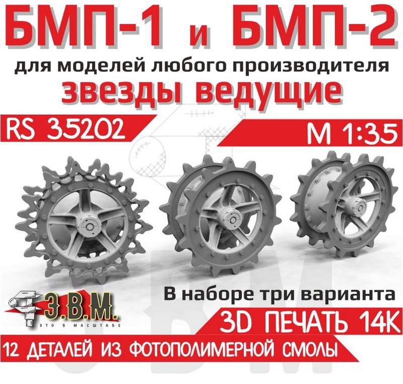 Севастопольская Э.В.М. выпустила на 3D-принтере ведущие колеса (три варианта зубчатых венцов) для моделей БМП-1/2 в масштабе 1/35: БМП-1 и БМП-2 звезды ведущие (каталожный номер RS35202)