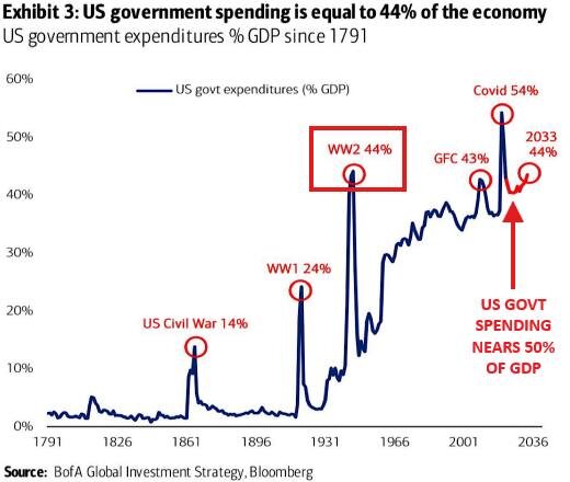 Он показывает долю государственных расходов США от ВВП за последние 230 лет. И здесь есть важная деталь: сегодняшний уровень госрасходов (около 44–50% ВВП) сравним с периодами мировой войны и ковидного кризиса.