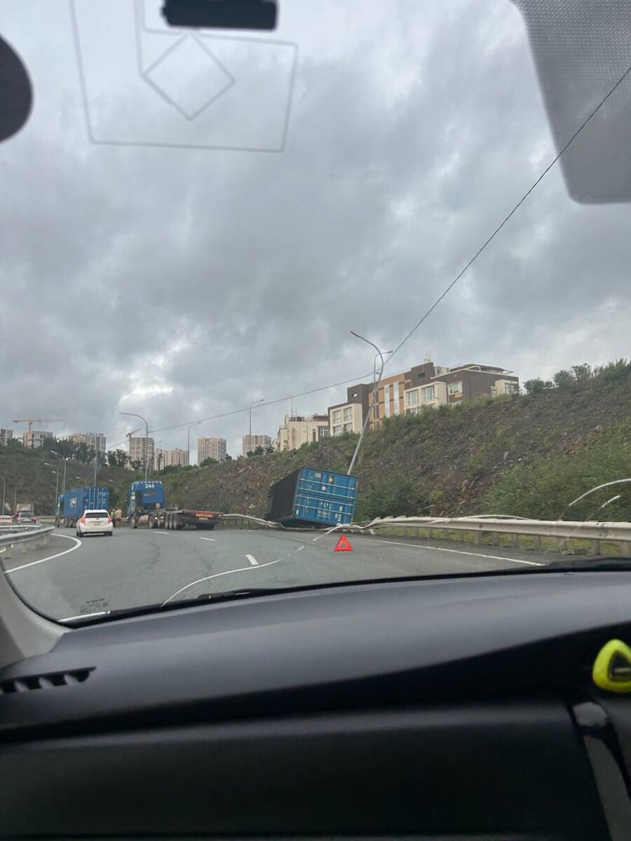 На объездной трассе в районе Патрокла из кузова фуры на ходу вывалился контейнер. Напоминает сцену из фильма "Пункт назначения".