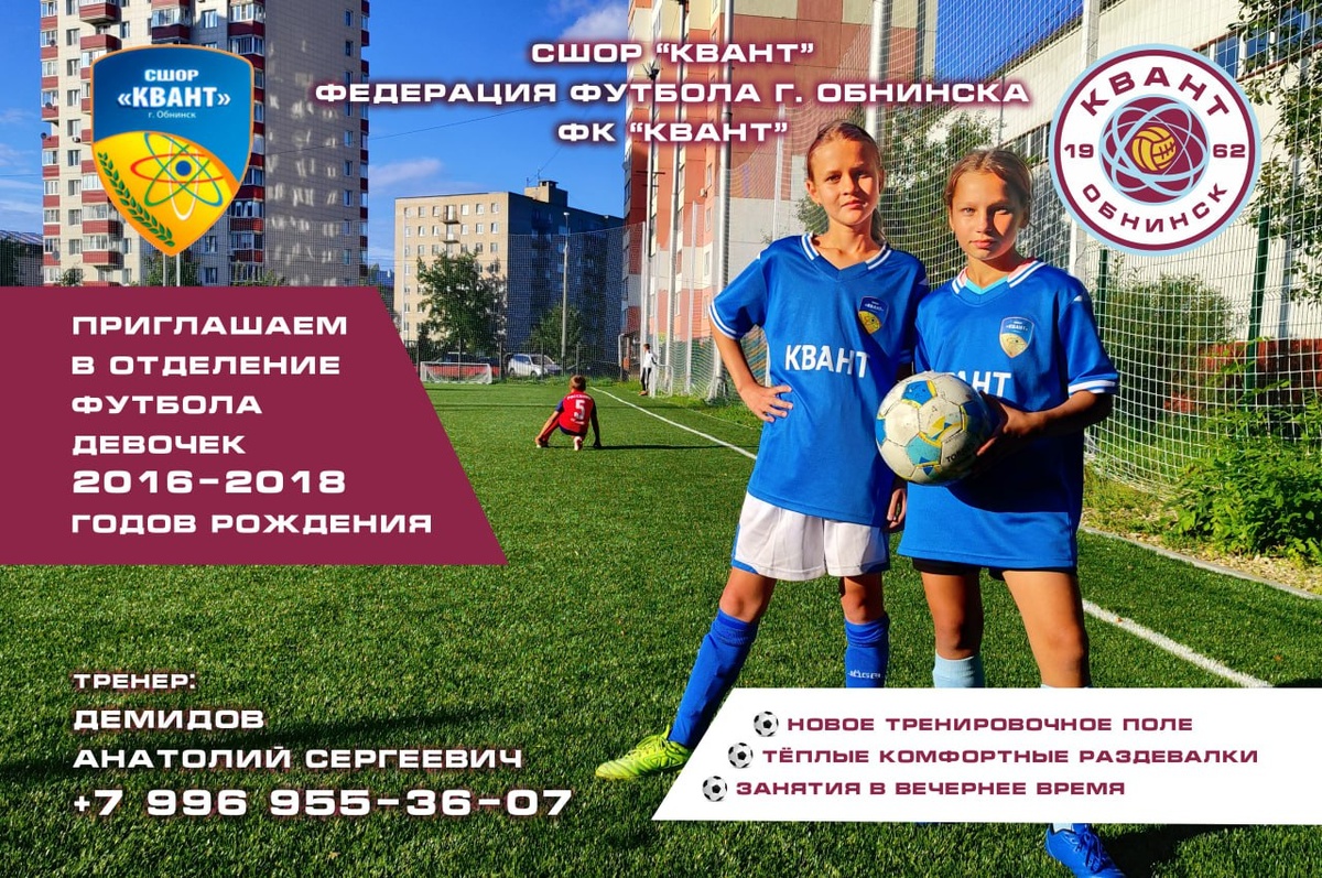 Та-дам! Это, наконец, случится! Квант приглашает девочек на занятия футболом! 🤗 СШОР "Квант" объявляет набор девочек 2016-2018 г.р. в женскую группу отделения футбола! ⚽️ Тренировки будут проходить в удобное для родителей вечернее время на новом тренировочном поле стадиона Труд. Детей ждут комфортные тёплые раздевалки в нашем футбольном доме, соседство с главной командой ФК "Квант" и старшими ребятами школы. Тренер команды - Демидов Анатолий Сергеевич. Запись по телефону: +7 996 955-36-07. Ждём в Кванте!