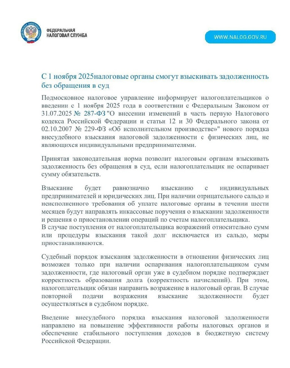Межрайонная ИФНС России №16 информирует: 🔵с 1 ноября 2025 года налоговые органы смогут взыскивать задолженность без обращения в суд; 🔵для многодетных родителей в беззаявительном порядке применяются вычеты по налогам на недвижимое имущество.