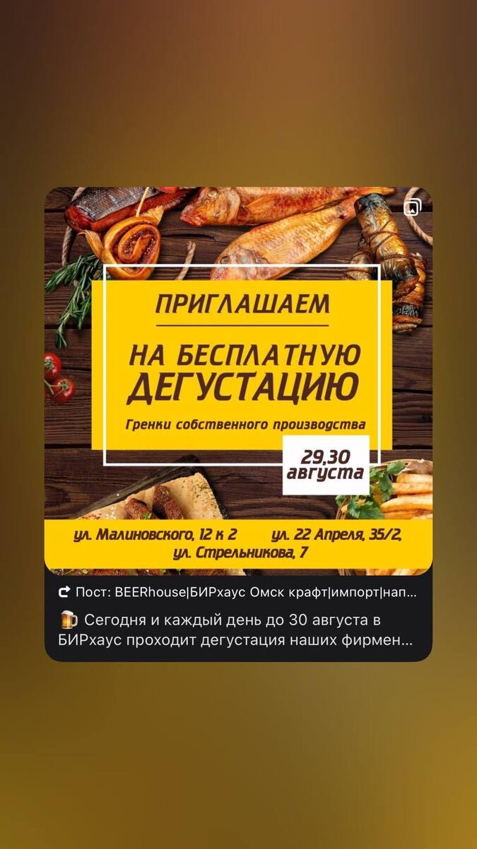 🍺 Сегодня и каждый день до 30 августа в БИРхаус проходит дегустация наших фирменных хрустящих гренок! 🎉 📍 Ждём вас по адресам: Малиновского, 12к2 22 апреля, 35/2 Стрельникова, 7 ✨ У нас открылось собственное производство, и теперь мы готовим для вас гренки свежими, ароматными и идеально хрустящими! 🥖 Это тот самый вкус, который идеально сочетается с любым пивом. Заходите уже сегодня!