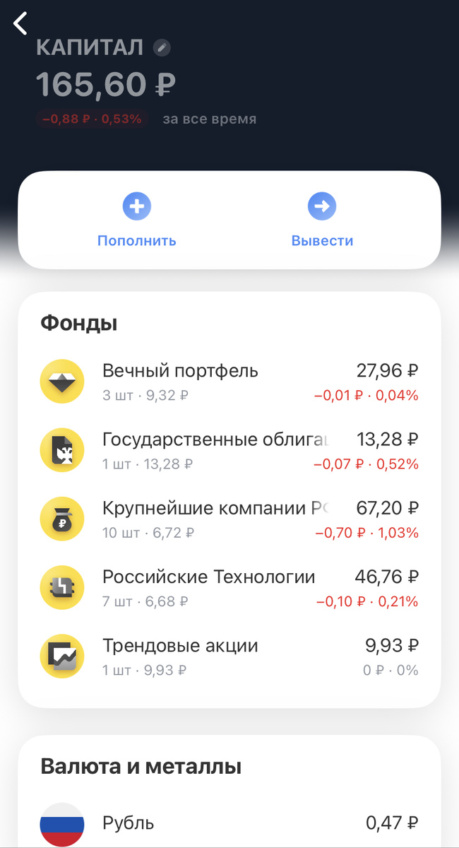 Как я уже написала ранее, мне скучно просто сидеть и смотреть на мой капитал, если допустимо так называть подобные суммы. ) Я отправляю на брокерский счет свой доход от Дзен и называю это инвестированием. Вообще изначально была идея покупать фонды (ни на что другое не хватит) и ждать, когда денег будет достаточно для покупки дивидендных акций или облигаций.