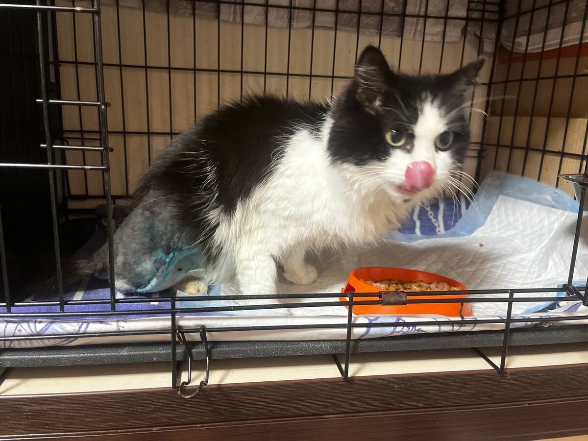 У кошки изначально давно была спинальная травма, как могла, ходила. Но видимо где то лапу свою зацепила и сломала и пошло воспаление и гниение. Сейчас она иногда нормально на оставшуюся заднюю лапку встает, но чаще всего она у нее выворачивается😶