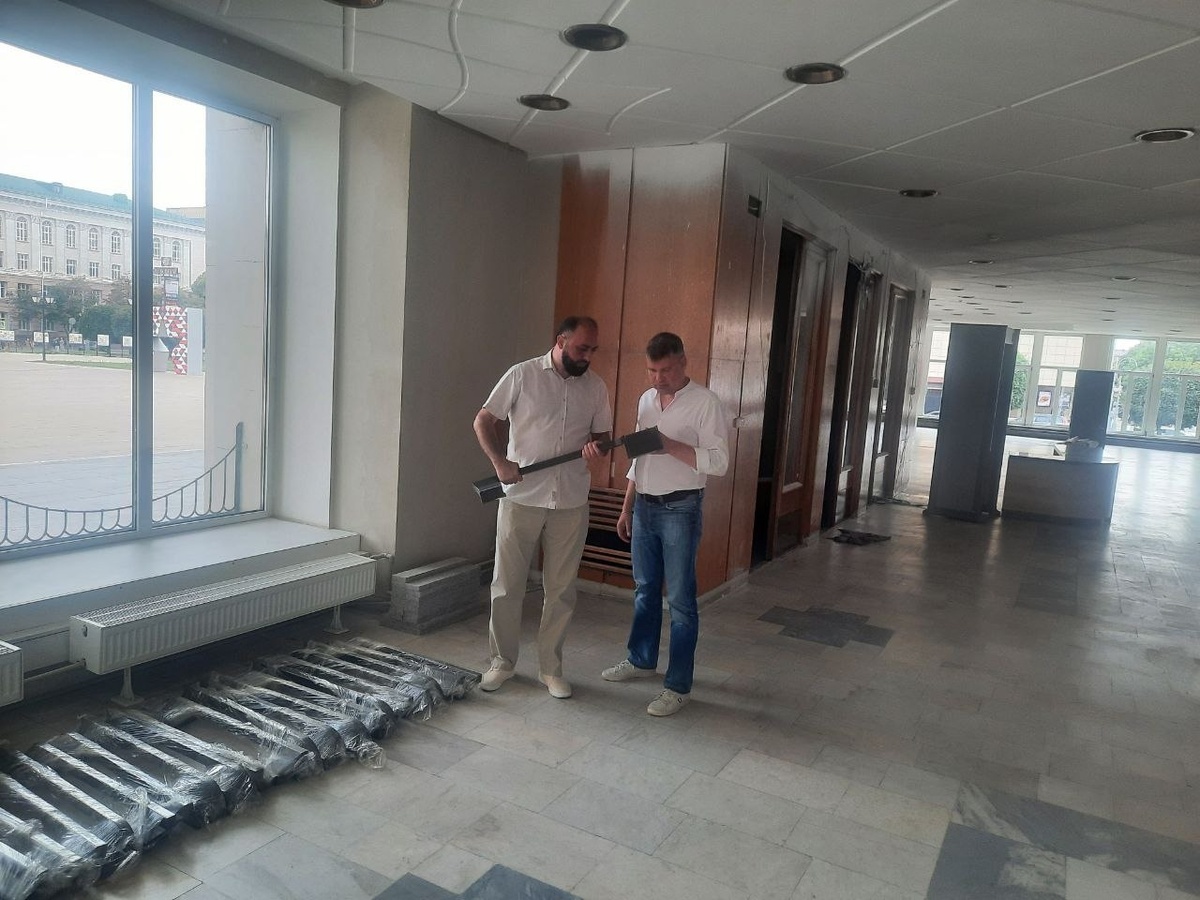 Курский областной драматический театр имени Пушкина готовится к новому сезону не только творчески. Так, зрителей встретит обновленный первый этаж. В театре демонтировали старые зеркала, светильники, пожарную сигнализацию, гранитные плиты. Расчистили потолок первого этажа. - Сейчас рабочие приступили к монтажу напольного покрытия и гранитных плит, - прокомментировал ход работ врио министра культуры Курской области Роберт Григорьян. Роберт Григорьян накануне проверил ход ремонта.