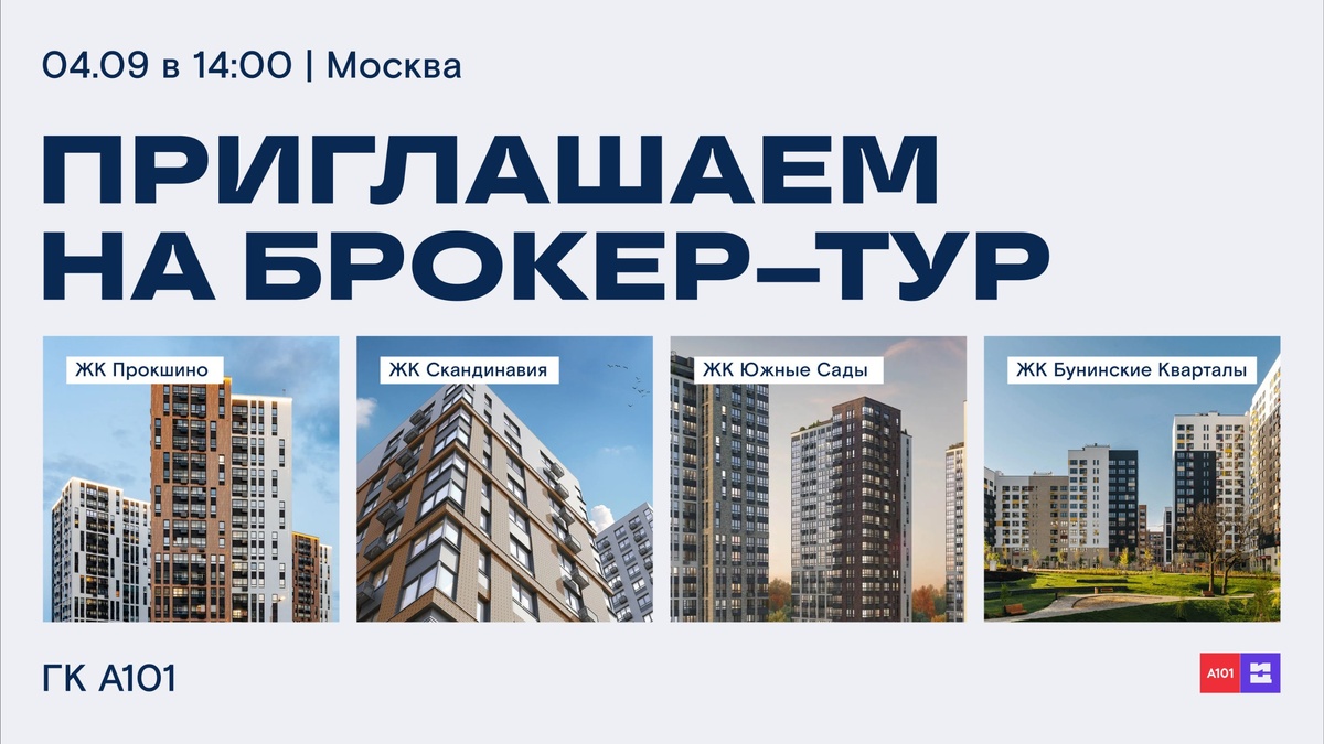 🧱🏦 Специальный брокер-тур к застройщику ГК А101 в Москве Приглашаем вас 4 сентября с 14:00 до 18:00 на специальный брокер-тур ГК А101 только для партнеров ИЦ 📌 В рамках тура посетим сразу четыре проекта: ✅Прокшино от 8,9 млн ₽ за 19,1 м² ✅Скандинавия от 8,7 млн ₽ за 19,8 м² ✅Южные Сады от 9,2 млн ₽ за 22,2 м² ✅Бунинские кварталы от 7,5 млн ₽ за 20,4 м² Передвижение между объектами — на комфортном автобусе. Вас будет сопровождать представитель платформы ИЦ, который расскажет: 🔘Как работать на платформе 🔘Как фиксировать клиентов 🔘Какие возможности дохода вы получаете при продаже объектов ГК А101 через ИЦ На каждом из объектов вас встретят представители ГК А101, чтобы подробно рассказать о проектах и условиях покупки, провести экскурсию, показать планировки, а также представить специальные предложения и скидки, доступные только клиентам партнёров ИЦ 📍Начало тура: 14:00, офис продаж ЖК Прокшино Адрес: Москва, поселение Сосенское, квартал № 35, 12/1с1 🧍♂️Количество мест огран