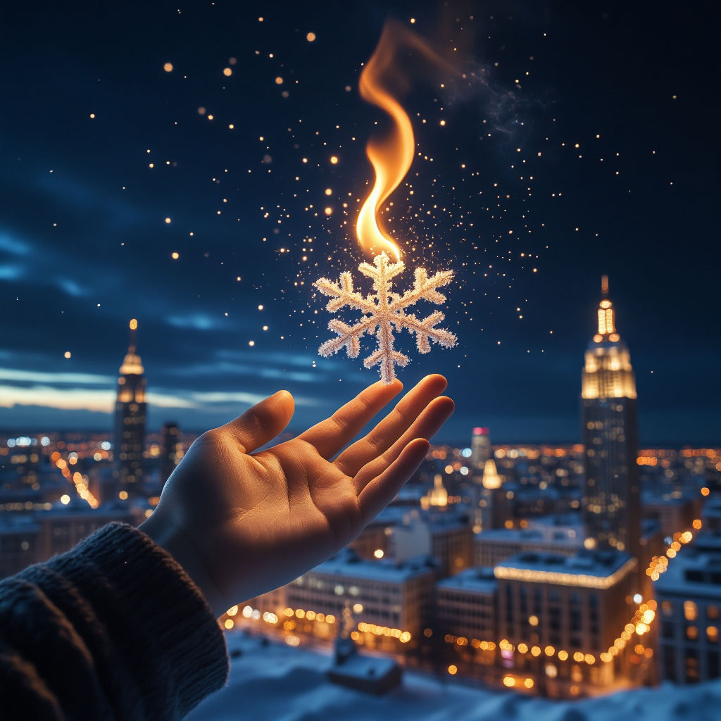 В одном очень старом лесу, на самой его опушке, стояла деревня. Жители этой деревни хранили важную традицию: каждый год в самый короткий зимний день он они разжигали огромный костёр. Считалось, что его пламя помогает солнцу набраться сил, чтобы поскорее вернуться и растопить лютый холод. Но в этом году случилась беда. Злая и колючая Вьюга, которая ненавидела тепло и радость, узнала об этом обычае. Она налетела на деревню раньше времени, замела все дороги сугробами и задула все печи. Даже спички в домах отказывались зажигаться. Вокруг воцарился холод, а в сердцах людей — печаль и безнадёжность. Без огня они не могли ни согреться, ни приготовить еду, а главное — не могли зажечь волшебный костёр. В самой глубине того леса, в уютной норке под корнями старого дуба, жил маленький добрый огонёк по имени Огонёк. Он был не простым, а волшебным — умел говорить и очень хотел помогать всем, кто мёрз от холода. Увидев, как в лесу потемнело и стало грустно, он решил добраться до деревни и помочь л