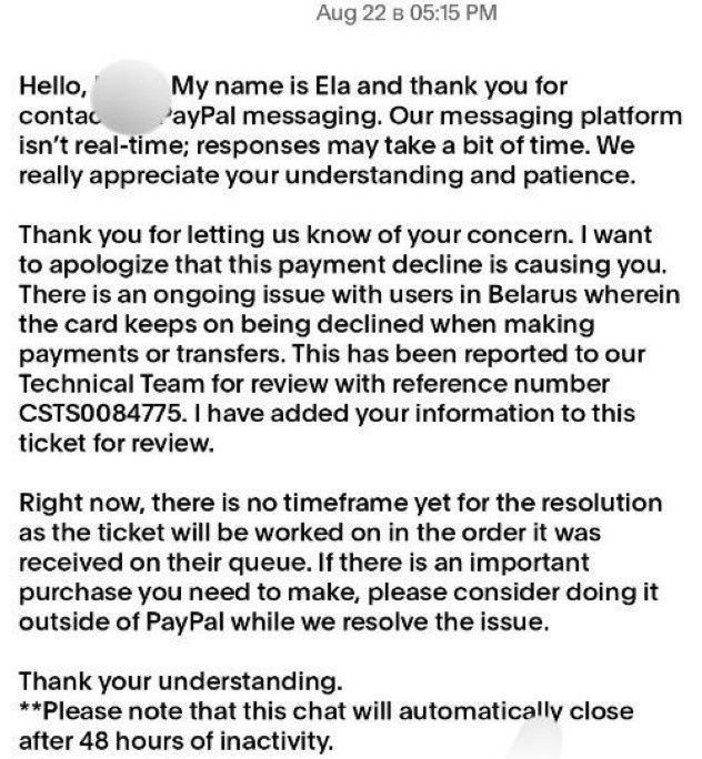 «Спасибо, что сообщили нам о своей проблеме. Приношу извинения за неудобства, связанные с отклонением платежа. В настоящее время у пользователей из Беларуси действительно наблюдается проблема, из-за которой карты отклоняются при попытках оплаты или перевода средств. Этот вопрос был передан нашей технической команде на рассмотрение под номером обращения CSTS0084775. Я добавила вашу информацию к этому тикету.